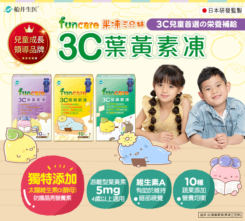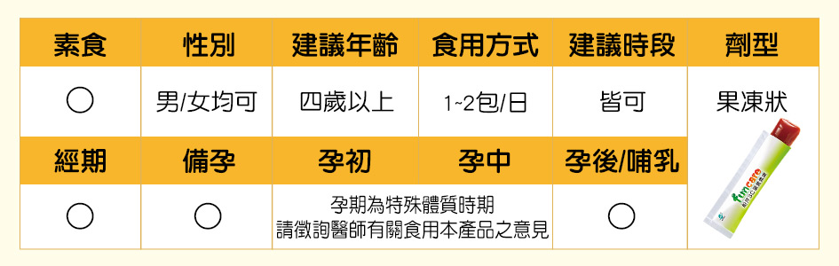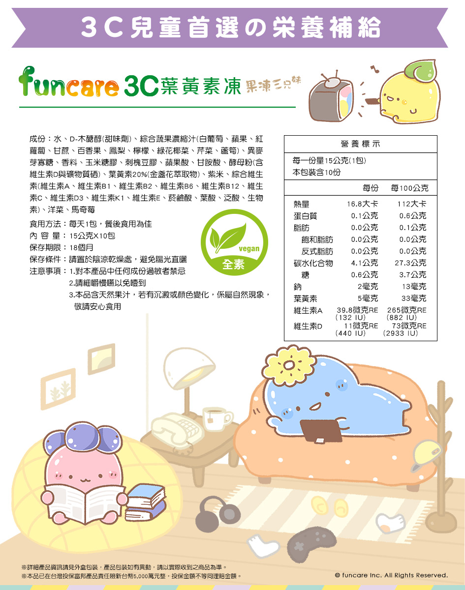 水、D-木醣醇(甜味劑)、綜合蔬果濃縮汁(白葡萄、蘋果、紅蘿蔔、甘蔗、百香果、鳳梨、檸檬、綠花椰菜、芹菜、蘆筍)、異麥芽寡糖、香料、玉米糖膠、刺槐豆膠、蘋果酸、甘胺酸、酵母粉(含維生素D與礦物質硒)、葉黃素20%(金盞花萃取物)、紫米、綜合維生素(維生素A、維生素B1、維生素B2、維生素B6、維生素B12、維生素C、維生素D3、維生素K1、維生素E、菸鹼酸、葉酸、泛酸、生物素)、洋菜、馬奇莓