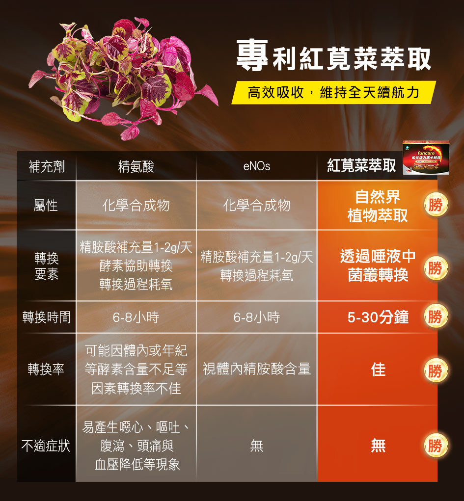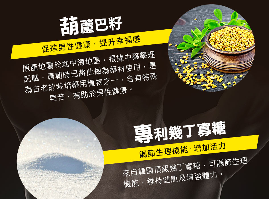 主原料:瑪卡萃取、莧菜萃取、葫蘆巴萃取、人參萃取、瓜拿納萃取、幾丁寡糖 副原料:水、高果糖漿、麥芽糊精、柑橘果膠、香料、葡萄糖酸鋅、DL-蘋果酸、甘草萃、蔗糖素