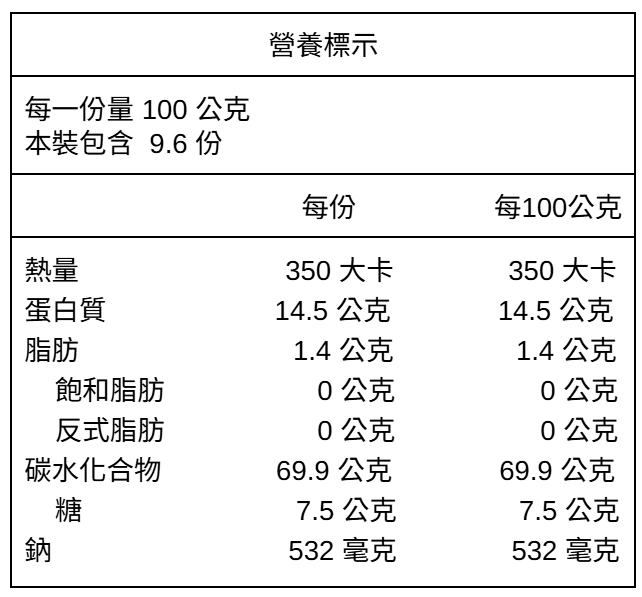 營養標示 每一份量 100 公克 本裝包含 4 份 每份 每100公克 熱量 350 大卡 350 大卡 蛋白質 14.5 公克 14.5 公克 脂肪 1.4 公克 1.4 公克 飽和脂肪 0 公克 0 公克 反式脂肪 0 公克 0 公克 碳水化合物 69.9 公克 69.9 公克 糖 7.5 公克 7.5 公克 鈉 532 毫克 532 毫克