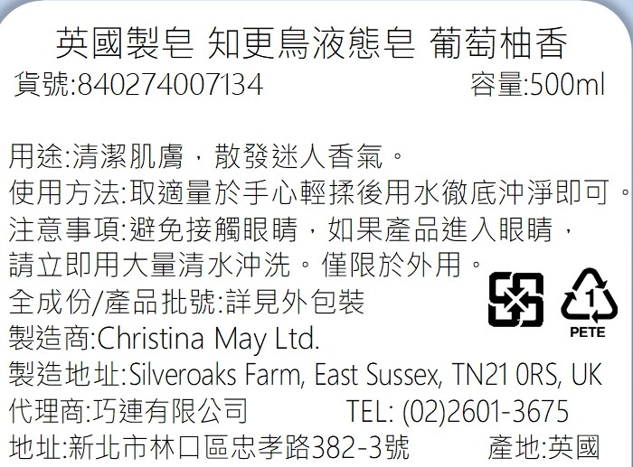 ◎Brand:英國製皂 ◎Specifications: 500ml毫升 x 1 x 1PC瓶