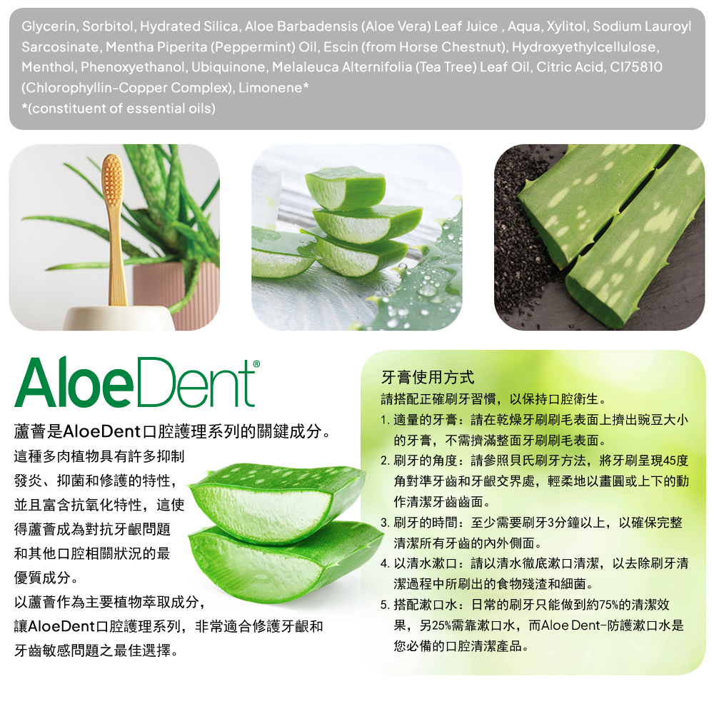Triple Action ToothpasteFights Bacteria │ Healthy Gums │ Fresh Breath蘆薈植萃 / 幫助舒緩牙齦茶樹精油 / 自然淨化口腔矽土 / 實現牙齒自然淨白輔酶Q10 / 幫助維持牙齦健康薄荷 / 讓口腔自然清新