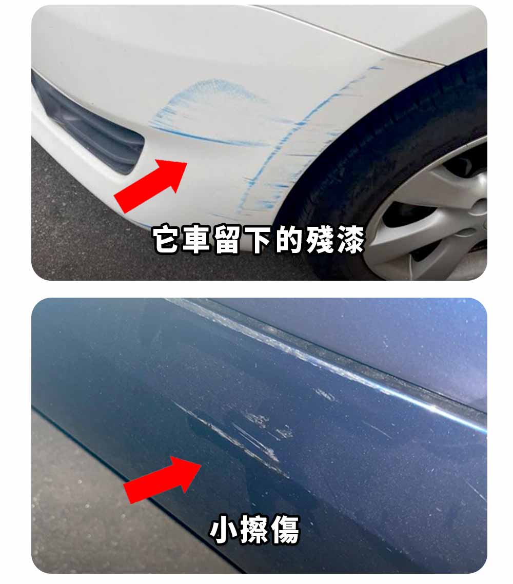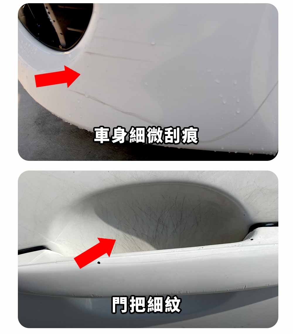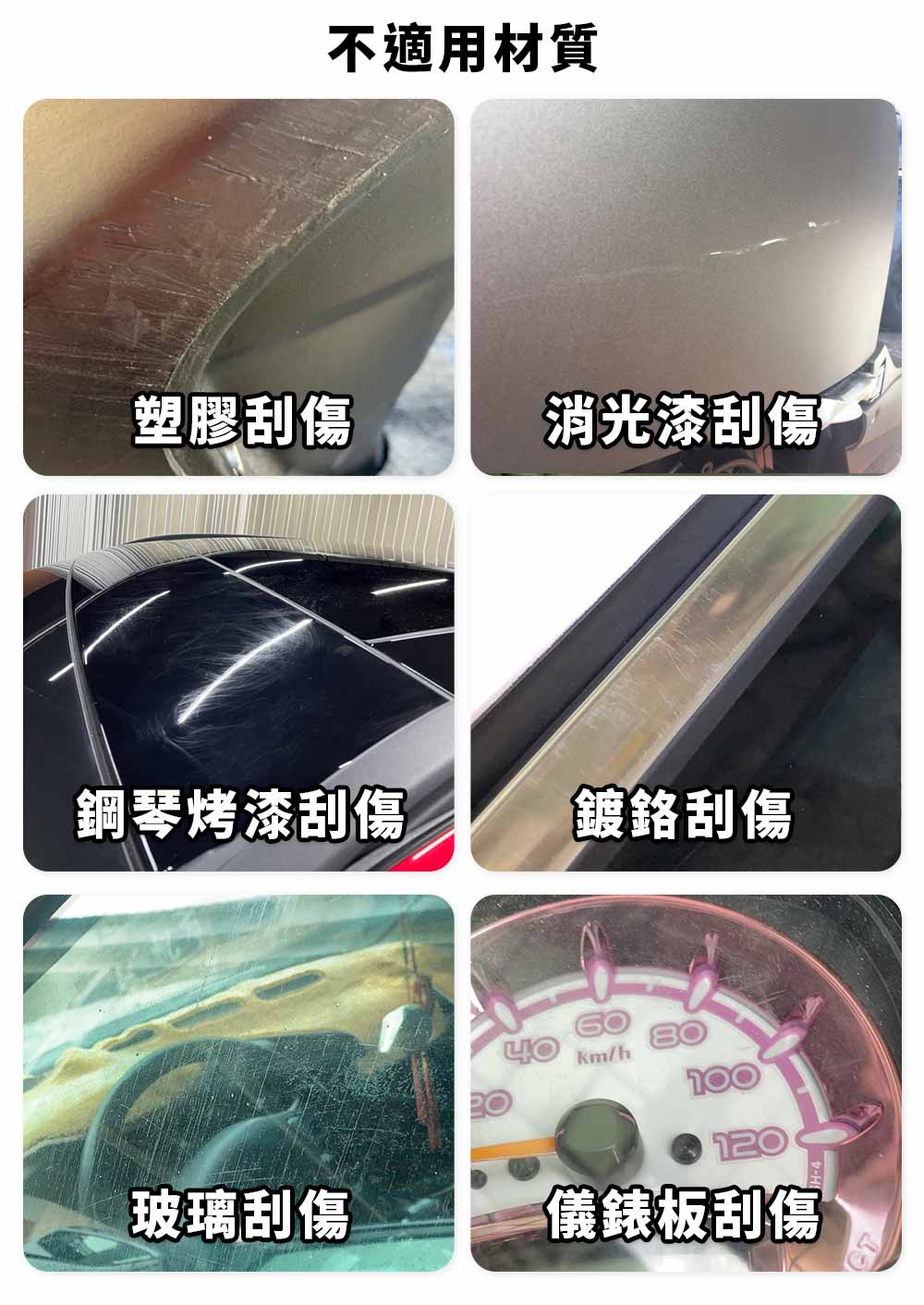 ‧不要使用在破裂和裂紋的烤漆上,不要過度研磨,可能會見到底漆。‧除了待處理區外,請勿將本產品使用在車體他處,可能會造成烤漆霧化。‧避免在不好施工有角的表面,如尾翼。‧不要使用在新漆(三個月內新車),烤漆有可能會被弄黯淡。‧使用時先在不明顯處測試相容性。‧車漆面粗糙老化或刮痕太多、太深之狀況將影響藥劑效果。‧請避免讓孩童接觸,若不慎觸及眼睛請以大量清水沖洗並就醫檢查。