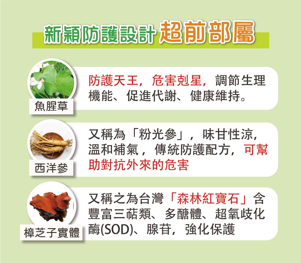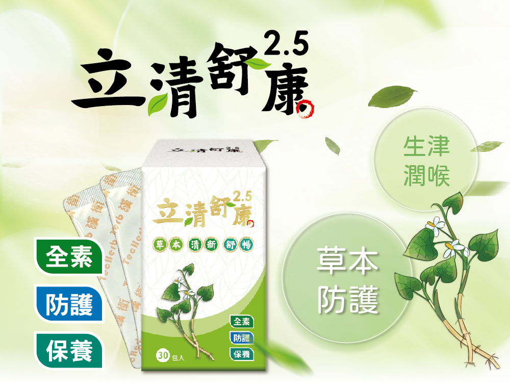 順天本草製造◎立清舒康2.5專為現代人打造,面對嚴峻的環境,不再害怕大口深呼吸。◎西洋參-又稱為「粉光參」,傳統保護呼吸道配方。◎魚腥草-防護天王,調節生理機能、促進代謝、健康維持。◎樟芝子實體又稱之為台灣「森林紅寶石」含豐富三萜類、多醣體、超氧歧化酶(SOD)、腺苷,強化保護。◎完整配方,提升保護力,天天舒暢。內容量:2公克/包,30包/盒建議用法:每日1〜2包,可直接口含或是配水食用。