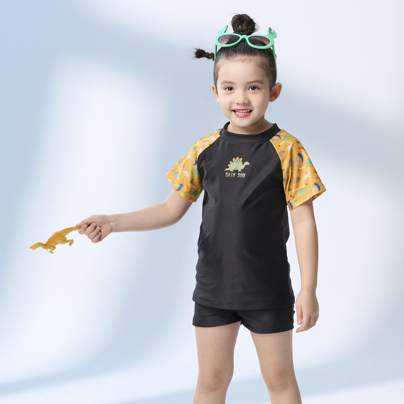 Monina, Made in Taiwan, Children's Short-Sleeve Two-Piece Sun Protection Swimsuit, Dinosaur Design, Suitable for Both Boys and Girls