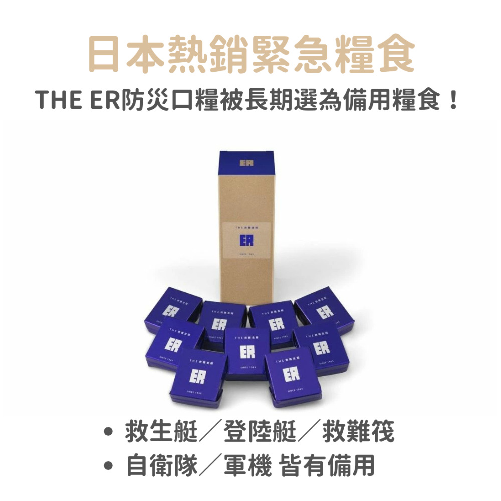 THE ER 長效期防災口糧 由 日本航空自衛隊 與 萬有營養株式會社 共同開發,專為緊急避難情境設計,兼具高能量、便利攜帶與長效保存,是日本熱銷的人氣防災食品。