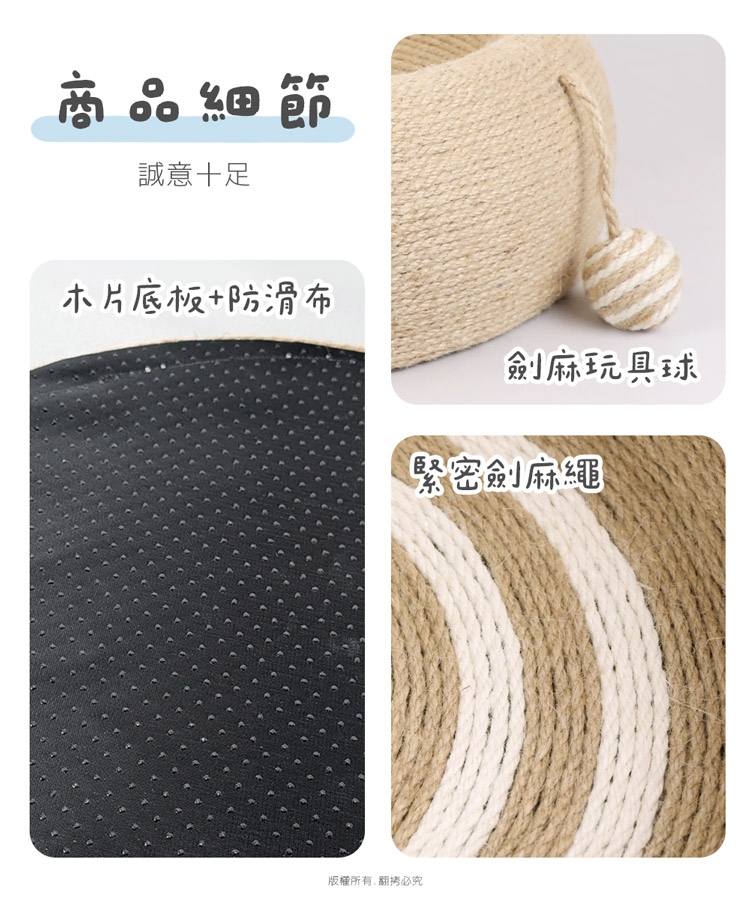 優質劍麻全包覆,不需組裝取出即用,將『休息貓窩』與