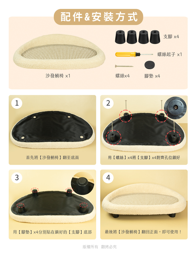 貓本屋 耐抓劍麻墊貓抓板沙發貓窩 --休息貓窩結合劍麻抓板,一物多用途----貓窩/貓床/貓抓板/磨爪,優質耐抓編織劍麻-- 輕鬆簡單組裝,將『休息貓窩』與『劍麻貓抓板』完美結合!立刻讓貓咪擁有一個可玩樂/磨爪/休息的地方! 貓窩採用舒適絨毛布包覆,全貓齡皆適用,玩累時可舒適躺臥精選耐磨劍麻繩編織而成的貓抓墊,結實耐用不易掉屑是兼顧美感與功能的寵物家俱好選擇。 注意事項: .本商品為接觸型商品,為避免傳染性疾病(如:跳蚤/壁虱/疥癬…等) 一經開封或試用過,恕不受理更換事宜。.購買前仔細詳閱商品規格尺寸,慎重購買,以免造成日後買賣糾紛。.本產品僅用於寵物使用,切勿用於其他用途。.商品圖檔顏色因電腦螢幕設定差異會略有不同,以實際商品顏色為準。.尺寸與重量皆採手工測量,±5%誤差屬正常範圍。 轉載敬告: 鈞嵐(立嵐)之商品圖文、影片或商標等,皆屬鈞嵐(立嵐)版權所有, 若未經同意即任意轉載刊登者,我司將進行相關智慧財產著作權與 商標權及商業法的追訴權利。 商品規格: .型 號:OO-P-SB32.品 名:貓本屋 耐抓劍麻墊貓抓板沙發貓窩.整體尺寸:整 體 約 38.5 x 60 x 19 cm (±5%/最大外徑) 劍麻墊 約 27.5 x 50 x 1 cm (±5%/使用內徑).重 量:約 552.5 g (±5%).材 質:劍麻、絨布、保麗龍、塑料.包裝內含:沙發躺椅 x1、支腳 x4、腳墊 x4、螺絲 x4、螺絲起子 x1.商品保固:僅限新品瑕疪更可換商品.產 地:中國大陸