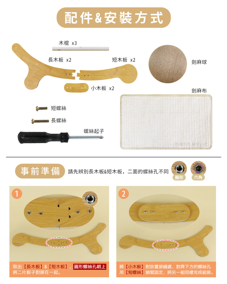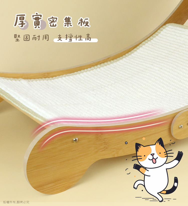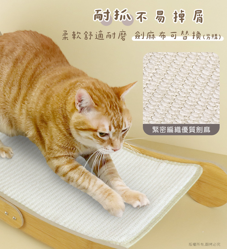 貓本屋 耐磨不掉屑 劍麻球劍麻貓抓板躺椅 -- 磨爪玩樂,臥躺無憂,耐玩劍麻繩球,適於全齡貓---- 優質編織劍麻布,可替換設計,耐抓不掉屑 -- 愛玩是貓的天性,而磨爪子會讓牠們感到開心!緊密劍麻繩球,任由貓咪轉動抓玩,盡情釋放天性!曲面劍麻布(可替換),貼合貓咪身體曲線,舒適自然伸展。 採用厚實密集板搭配木棍設計,結構緊密牢固耐用!劍麻繩摩天輪球與緊密編織劍麻布,可供貓咪磨爪。給愛玩的貓咪磨爪子滿足天性!是兼具動與靜多功能的設計,立刻讓貓咪擁有一個可以玩樂/磨爪/睡覺的好物!注意事項: .本商品為接觸型商品,為避免傳染性疾病(如:跳蚤/壁蝨/疥癬…等) 一經開封或試用過,恕不受理更換事宜。.請遠離高溫源(如:暖氣、火爐…等),以免不慎點燃。.請避免放置於水源或是水氣多的地方,避免密集板受潮。.本產品僅供寵物使用,請勿做其他用途。.購買前仔細詳閱商品規格尺寸,慎重購買,以免造成日後買賣糾紛。.商品圖檔顏色因電腦螢幕設定差異會略有不同,以實際商品顏色為準。.尺寸與重量皆採手工測量,±5%誤差屬正常範圍。 轉載敬告: 鈞嵐(立嵐)之商品圖文、影片或商標等,皆屬鈞嵐(立嵐)版權所有, 若未經同意即任意轉載刊登者,我司將進行相關智慧財產著作權與 商標權及商業法的追訴權利。 商品規格: .型 號:OO-P-SB27.品 名:貓本屋 耐磨不掉屑 劍麻球劍麻貓抓板躺椅.尺 寸:約 32.5 x 72 x 32.5 cm (最大外徑).重 量:約 1.29 kg.球體直徑:約 Ø18.5 cm.劍 麻 布:約 30 x 50.5 cm / 約 197 g.材 質:劍麻、密集板、木頭、塑料.隨附配件:長木板 x2、短木板 x2、小木板 x3、劍麻布 x1、劍麻球 x1、 木棍 x3、短螺絲 x8、長螺絲 x6、螺絲起子 x1.商品保固:僅限新品瑕疵更可換商品.產 地:中國大陸