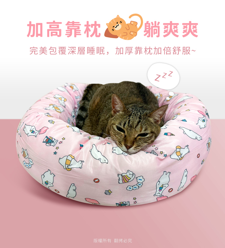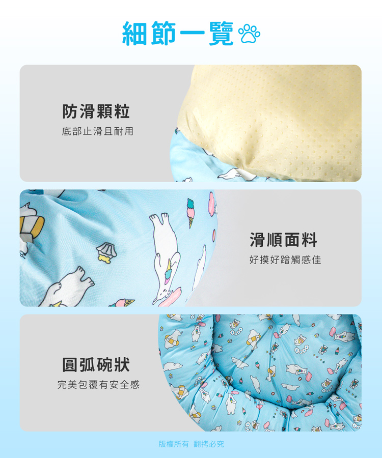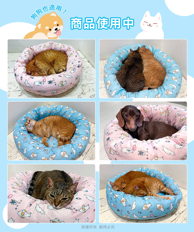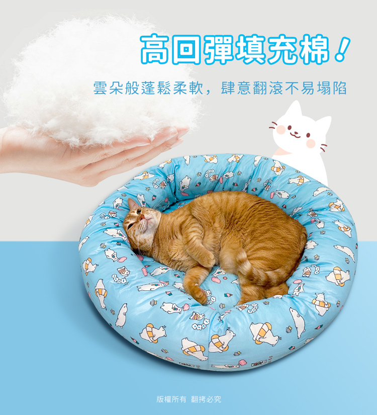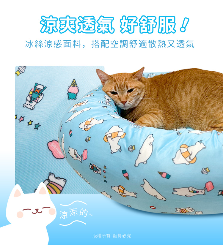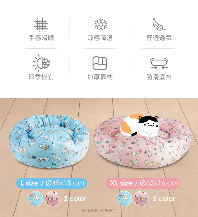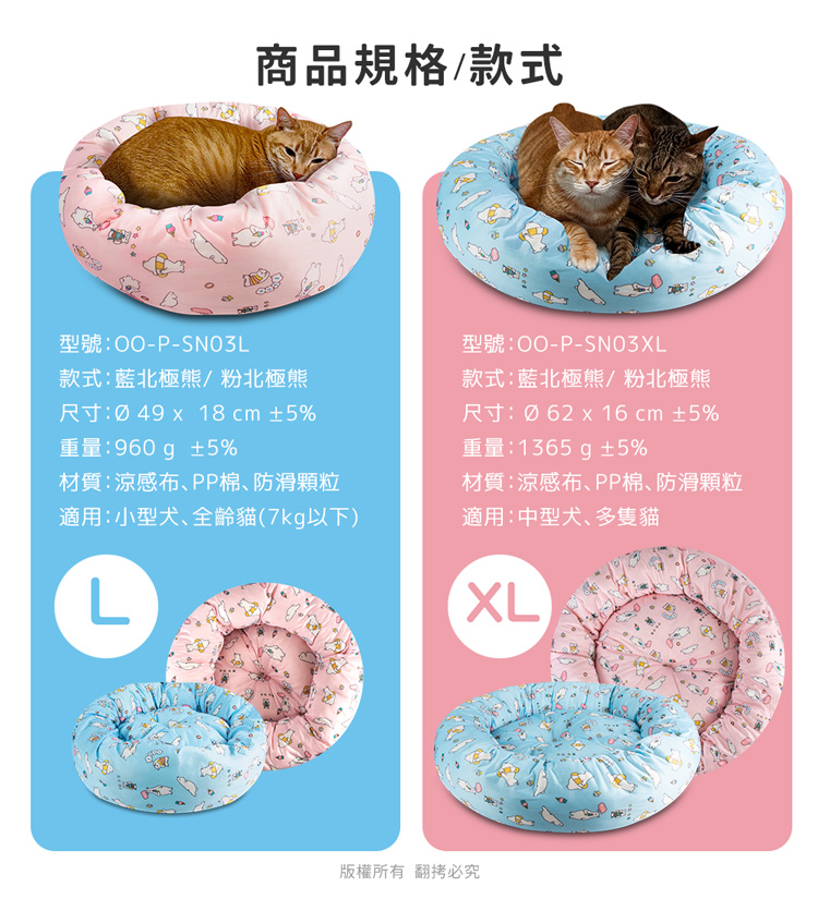 貓本屋 涼感降溫冰絲寵物涼墊/睡窩(L號)★貓狗適用★ --冰絲降溫,涼爽舒適,告別黏膩!-- 炎炎夏日,擔心冷氣費貴、更怕獨自留在家中的毛孩們太熱!尤其毛小孩的體溫又比人略高,除了通風的環境、提供充足的水份之外還能提供什麼避暑良方呢? 【冰絲涼感 貓狗寵物涼墊/睡窩】,表面採用冰絲涼感面料,快速散熱且透氣,加上親膚滑順的觸感,好摸好蹭沁涼一整天! 清新北極熊圖案,共有兩色選擇(藍/粉),打造可愛居家風!外觀為圓弧碗狀設計,搭配加厚繞圈靠枕完美包覆,安全感滿滿。同時內部填充了高回彈的PP棉,如雲朵般蓬鬆柔軟,舒爽好好睡!可直接放置於寵物窩、籠子、地板、沙發上…等,趕快使用降溫墊,讓毛小孩擁有一個涼爽的休憩環境吧! ※請避免使用尖銳物割刺、或是寵物啃咬,以免造成破損。※若沾染髒污時,請立即使用濕布擦拭,避免長時間滲透! 注意事項: .本商品為接觸型商品,為避免傳染性疾病(如:跳蚤/壁虱/疥癬…等) 一經開封或試用過,恕不受理更換事宜。.本產品僅供寵物使用,請勿做其他用途。.若於溫度35℃以上的環境使用,可搭配電扇或空調,可提高使用效果。.收納存放時,請放置於陰涼乾燥處,請避免靠近火源/高溫/陽光直射。.欲清理時,可直接水洗,並搭配中性潔劑,清洗完畢時直接陰乾。.請避免使用尖銳物割刺、或是寵物啃咬,以免造成布面破損。.商品圖檔顏色因電腦螢幕設定差異會略有不同,以實際商品顏色為準。.購買前仔細詳閱商品規格尺寸,慎重購買,以免造成日後買賣糾紛。.所有的規格與重量皆採手工測量,誤差±5%屬正常範圍。 轉載警示: 自民國108年6月1日起(含追溯既往),鈞嵐(立嵐)企業有限公司之 商品圖片、影片或鈞嵐(立嵐)企業有限公司文字及LOGO, 任何客戶或用戶需轉載刊登任何圖片、文字、影片 皆需經過鈞嵐(立嵐)書面同意,如有需求請與鈞嵐(立嵐)客服中心接洽聯絡。 若任何未經鈞嵐(立嵐)同意即任意轉載刊登者, 我司將進行相關智慧財產著作權與商標權及商業法的追訴權利。 商品規格: .型 號:OO-P-SN03L.品 名:貓本屋 涼感降溫冰絲寵物涼墊/睡窩(L號).款 式:藍北極熊/粉北極熊.尺 寸:約 Ø 49 x 18 cm ±5%.重 量:約 960 g ±5%.材 質:涼感布、填充棉、防滑顆粒.包裝方式:袋裝.包裝內含:冰絲涼感寵物墊 x1.商品保固:僅限新品瑕疪更可換商品.產 地:中國大陸