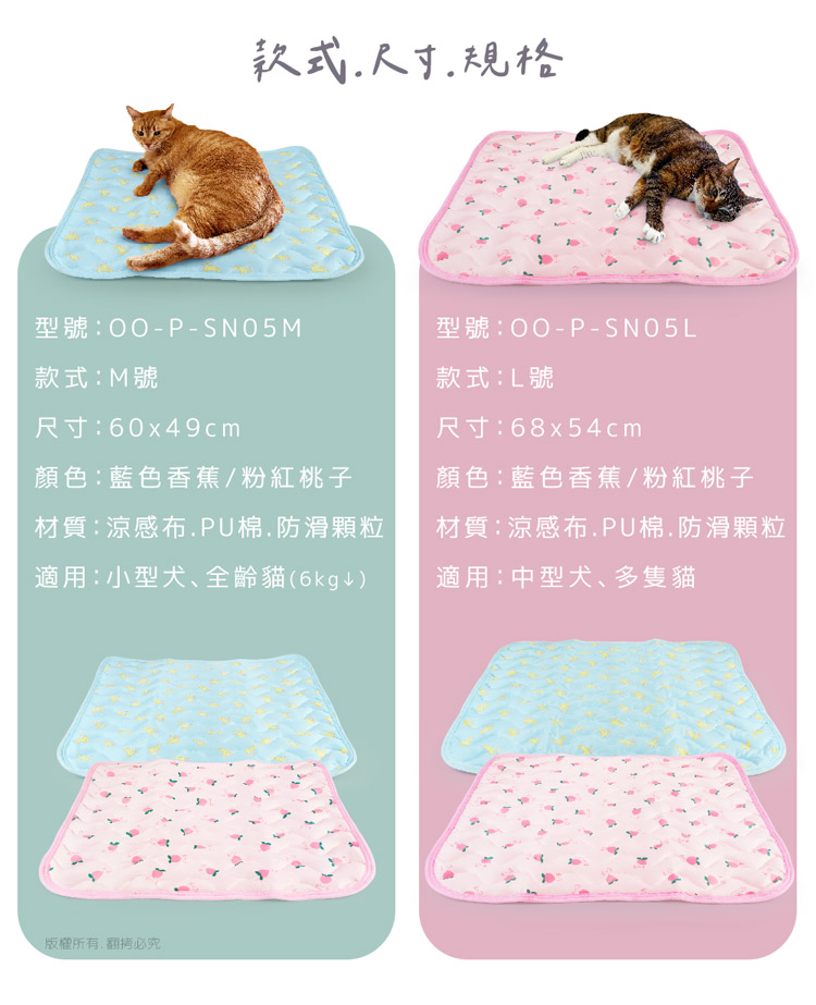 貓本屋 涼感降溫冰絲寵物涼墊(L號/68x54cm)★貓狗適用★ --溫和且迅速降溫,涼爽舒適,告別黏膩!-- 炎炎夏日,擔心冷氣費貴、更怕獨自留在家中的毛孩們太熱!尤其毛小孩的體溫又比人略高,除了通風的環境、提供充足的水份之外還能提供什麼避暑良方呢? 【涼感降溫冰絲寵物涼墊】,採用冰絲涼感面料,皮膚接觸這種面料,會感到冰涼滑順,夏天不再擔心毛小孩太熱,不用吹冷氣也可以涼涼的!絕對是今年夏天的不二選擇! 安全無害印染,可愛水果圖案搭配雙色印刷,打造溫馨美感!可直接放置於寵物窩、籠子、地板、沙發上…等,趕快使用降溫墊,讓毛小孩擁有一個涼爽的休憩環境吧! ※請避免使用尖銳物割刺、或是寵物啃咬,以免造成破損。※若沾染髒污時,請立即使用濕布擦拭,避免長時間滲透! 注意事項: .本商品為接觸型商品,為避免傳染性疾病(如:跳蚤/壁虱/疥癬…等) 一經開封或試用過,恕不受理更換事宜。.本產品僅供寵物使用,請勿做其他用途。.若於溫度35℃以上的環境使用,可搭配電扇或空調,可提高使用效果。.收納存放時,請放置於陰涼乾燥處,請避免靠近火源/高溫/陽光直射。.欲清理時,可直接水洗,並搭配中性潔劑,清洗完畢時直接陰乾。.請避免使用尖銳物割刺、或是寵物啃咬,以免造成布面破損。.商品圖檔顏色因電腦螢幕設定差異會略有不同,以實際商品顏色為準。.購買前仔細詳閱商品規格尺寸,慎重購買,以免造成日後買賣糾紛。.所有的規格與重量皆採手工測量,誤差±5%屬正常範圍。 轉載警示: 自民國108年6月1日起(含追溯既往),鈞嵐(立嵐)企業有限公司之 商品圖片、影片或鈞嵐(立嵐)企業有限公司文字及LOGO, 任何客戶或用戶需轉載刊登任何圖片、文字、影片 皆需經過鈞嵐(立嵐)書面同意,如有需求請與鈞嵐(立嵐)客服中心接洽聯絡。 若任何未經鈞嵐(立嵐)同意即任意轉載刊登者, 我司將進行相關智慧財產著作權與商標權及商業法的追訴權利。 商品規格: .型 號:OO-P-SN05L.品 名:貓本屋 涼感降溫冰絲寵物涼墊.款 式:藍色香蕉/粉紅桃子.尺 寸:約 68 x 54 cm.重 量:約 146.5 g.材 質:涼感布、填充棉、防滑顆粒.包裝方式:袋裝.包裝內含:冰絲寵物涼墊 x1.商品保固:僅限新品瑕疪更可換商品.產 地:中國大陸