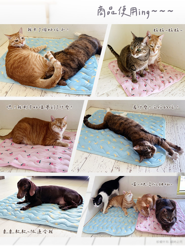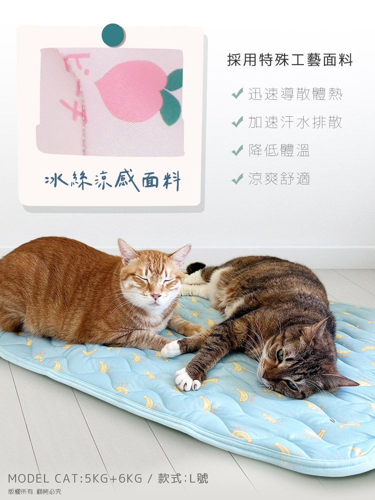 貓本屋 涼感降溫冰絲寵物涼墊(M號/60x49cm)★貓狗適用★ --溫和且迅速降溫,涼爽舒適,告別黏膩!-- 炎炎夏日,擔心冷氣費貴、更怕獨自留在家中的毛孩們太熱!尤其毛小孩的體溫又比人略高,除了通風的環境、提供充足的水份之外還能提供什麼避暑良方呢? 【涼感降溫冰絲寵物涼墊】,採用冰絲涼感面料,皮膚接觸這種面料,會感到冰涼滑順,夏天不再擔心毛小孩太熱,不用吹冷氣也可以涼涼的!絕對是今年夏天的不二選擇! 安全無害印染,可愛水果圖案搭配雙色印刷,打造溫馨美感!可直接放置於寵物窩、籠子、地板、沙發上…等,趕快使用降溫墊,讓毛小孩擁有一個涼爽的休憩環境吧! ※請避免使用尖銳物割刺、或是寵物啃咬,以免造成破損。※若沾染髒污時,請立即使用濕布擦拭,避免長時間滲透! 注意事項: .本商品為接觸型商品,為避免傳染性疾病(如:跳蚤/壁虱/疥癬…等) 一經開封或試用過,恕不受理更換事宜。.本產品僅供寵物使用,請勿做其他用途。.若於溫度35℃以上的環境使用,可搭配電扇或空調,可提高使用效果。.收納存放時,請放置於陰涼乾燥處,請避免靠近火源/高溫/陽光直射。.欲清理時,可直接水洗,並搭配中性潔劑,清洗完畢時直接陰乾。.請避免使用尖銳物割刺、或是寵物啃咬,以免造成布面破損。.商品圖檔顏色因電腦螢幕設定差異會略有不同,以實際商品顏色為準。.購買前仔細詳閱商品規格尺寸,慎重購買,以免造成日後買賣糾紛。.所有的規格與重量皆採手工測量,誤差±5%屬正常範圍。 轉載警示: 自民國108年6月1日起(含追溯既往),鈞嵐(立嵐)企業有限公司之 商品圖片、影片或鈞嵐(立嵐)企業有限公司文字及LOGO, 任何客戶或用戶需轉載刊登任何圖片、文字、影片 皆需經過鈞嵐(立嵐)書面同意,如有需求請與鈞嵐(立嵐)客服中心接洽聯絡。 若任何未經鈞嵐(立嵐)同意即任意轉載刊登者, 我司將進行相關智慧財產著作權與商標權及商業法的追訴權利。 商品規格: .型 號:OO-P-SN05M.品 名:貓本屋 涼感降溫冰絲寵物涼墊.款 式:藍色香蕉/粉紅桃子.尺 寸:約 60 x 49 cm.重 量:約 136.6 g.材 質:涼感布、填充棉、防滑顆粒.包裝方式:袋裝.包裝內含:冰絲寵物涼墊 x1.商品保固:僅限新品瑕疪更可換商品.產 地:中國大陸