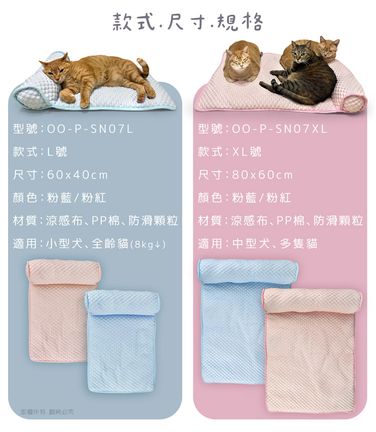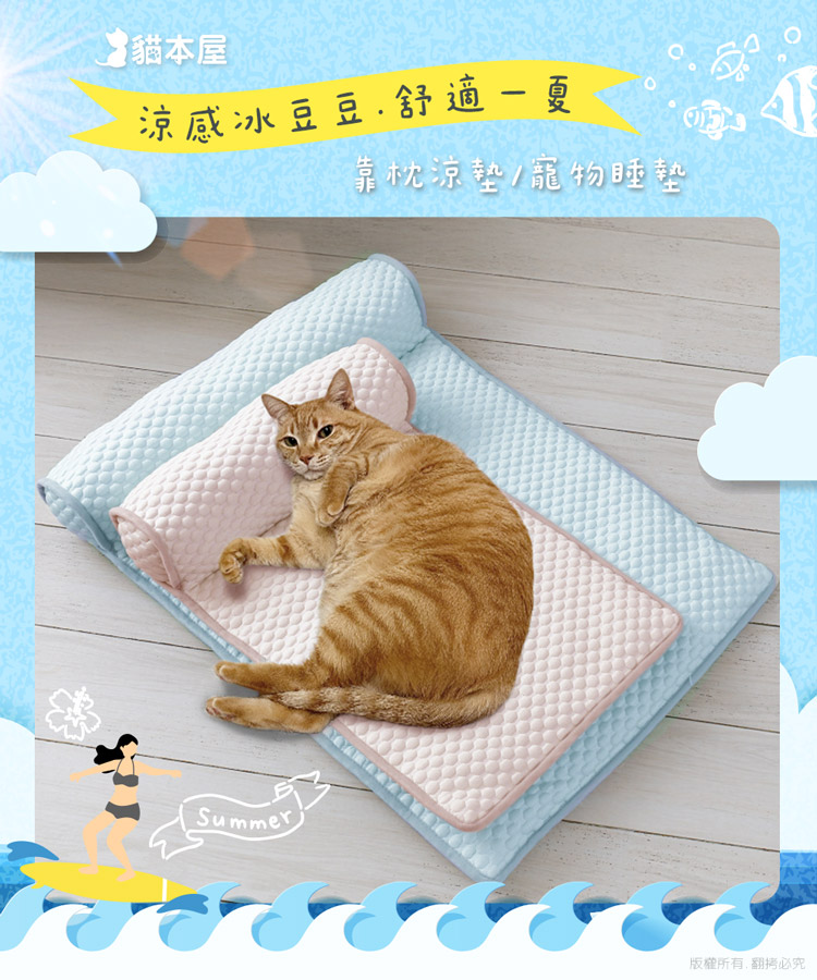 貓本屋 冰豆豆涼感 靠枕寵物睡墊(L號/60x40cm)★貓狗適用★ --溫和迅速降溫,涼爽舒適,告別黏膩!-- 炎炎夏日,擔心冷氣費貴、更怕獨自留在家中的毛孩們太熱!尤其毛小孩的體溫又比人略高,除了通風的環境、提供充足的水份之外還能提供什麼避暑良方呢? 【冰豆豆涼感寵物墊】,採用冰豆豆涼感冰絲面料,皮膚接觸這種面料,會感到冰涼滑順,夏天不再擔心毛小孩太熱,不用吹冷氣也可以涼涼的!絕對是今年夏天的不二選擇! 圓弧靠枕內部填充高回彈的PP棉,如雲朵般蓬鬆柔軟,舒爽靠著睡可直接放置於寵物窩、籠子、地板、沙發上…等,趕快使用降溫墊,讓毛小孩擁有一個涼爽的休憩環境吧! ※請避免使用尖銳物割刺、或是寵物啃咬,以免造成破損。※若沾染髒污時,請立即使用濕布擦拭,避免長時間滲透!※若於溫度35℃以上的環境使用,可搭配電扇或空調,可提高使用效果。注意事項: .本商品為接觸型商品,為避免傳染性疾病(如:跳蚤/壁虱/疥癬…等) 一經開封或試用過,恕不受理更換事宜。.本產品僅供寵物使用,請勿做其他用途。.若於溫度35℃以上的環境使用,可搭配電扇或空調,可提高使用效果。.收納存放時,請放置於陰涼乾燥處,請避免靠近火源/高溫/陽光直射。.欲清理時,可直接水洗,並搭配中性潔劑,清洗完畢時直接陰乾。.請避免使用尖銳物割刺、或是寵物啃咬,以免造成布面破損。.商品圖檔顏色因電腦螢幕設定差異會略有不同,以實際商品顏色為準。.購買前仔細詳閱商品規格尺寸,慎重購買,以免造成日後買賣糾紛。.所有的規格與重量皆採手工測量,誤差±5%屬正常範圍。 轉載敬告: 鈞嵐(立嵐)之商品圖文、影片或商標等,皆屬鈞嵐(立嵐)版權所有, 若未經同意即任意轉載刊登者,我司將進行相關智慧財產著作權與 商標權及商業法的追訴權利。 商品規格: .型 號:OO-P-SN07L.品 名:貓本屋 冰豆豆涼感 靠枕寵物睡墊(L號).款 式:粉藍/粉紅.尺 寸:約 60 x 40 x 1.8 cm / 靠枕厚度 11 cm.重 量:約 394.4 g.材 質:涼感布、PP棉、防滑顆粒.包裝方式:袋裝.包裝內含:冰豆豆涼感寵物墊 x1.商品保固:僅限新品瑕疵更可換商品.產 地:中國大陸