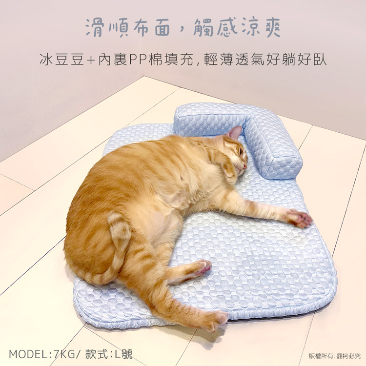 貓本屋 冰豆豆涼感 可拆洗靠枕寵物睡墊(XL號/80x60cm)★貓狗適用★ --溫和迅速降溫,涼爽舒適,告別黏膩!-- 炎炎夏日,擔心冷氣費貴、更怕獨自留在家中的毛孩們太熱!尤其毛小孩的體溫又比人略高,除了通風的環境、提供充足的水份之外還能提供什麼避暑良方呢? 【冰豆豆涼感 可拆洗靠枕寵物睡墊】,採用冰豆豆涼感冰絲面料,皮膚接觸這種面料,會感到冰涼滑順,夏天不再擔心毛小孩太熱,不用吹冷氣也可以涼涼的!絕對是今年夏天的不二選擇! 底部海綿墊可拆出,方便清洗易打理!L型靠枕內部填充高回彈的PP棉,如雲朵般蓬鬆柔軟,舒爽靠著睡,可放置於籠子、推車、地板、沙發上…等,趕快使用降溫墊,讓毛小孩擁有一個涼爽的休憩環境吧! ※欲清理時,請先將底部的海綿墊取出,使用溫水手洗, 並搭配中性潔劑,清洗完畢後請放至通風處晾乾即可!※請避免使用尖銳物割刺、或是寵物啃咬,以免造成破損。※若沾染髒污時,請立即使用濕布擦拭,避免長時間滲透!※本產品不可漂白、不可熨燙、不可烘乾!注意事項: .本商品為接觸型商品,為避免傳染性疾病(如:跳蚤/壁蝨/疥癬…等) 一經開封或試用過,恕不受理更換事宜。.本產品僅供寵物使用,請勿做其他用途。.若於溫度35℃以上的環境使用,可搭配電扇或空調,可提高使用效果。.收納存放時,請放置於陰涼乾燥處,請避免靠近火源/高溫/陽光直射。.欲清理時,可直接水洗,並搭配中性潔劑,清洗完畢時直接陰乾。.請避免使用尖銳物割刺、或是寵物啃咬,以免造成布面破損。.商品圖檔顏色因電腦螢幕設定差異會略有不同,以實際商品顏色為準。.購買前仔細詳閱商品規格尺寸,慎重購買,以免造成日後買賣糾紛。.所有的規格與重量皆採手工測量,誤差±5%屬正常範圍。 轉載敬告: 鈞嵐(立嵐)之商品圖文、影片或商標等,皆屬鈞嵐(立嵐)版權所有, 若未經同意即任意轉載刊登者,我司將進行相關智慧財產著作權與 商標權及商業法的追訴權利。 商品規格: .型 號:OO-P-SN08XL.品 名:貓本屋 冰豆豆涼感 可拆洗靠枕寵物睡墊(XL號).款 式:粉藍/淺灰.尺 寸:約 80 x 60 x 2.4 cm / 靠枕厚 8 cm.重 量:約 779 g.材 質:涼感布、海綿、PP棉、防滑顆粒.包裝方式:袋裝.包裝內含:冰豆豆涼感寵物睡墊 x1.商品保固:僅限新品瑕疪更可換商品.產 地:中國大陸
