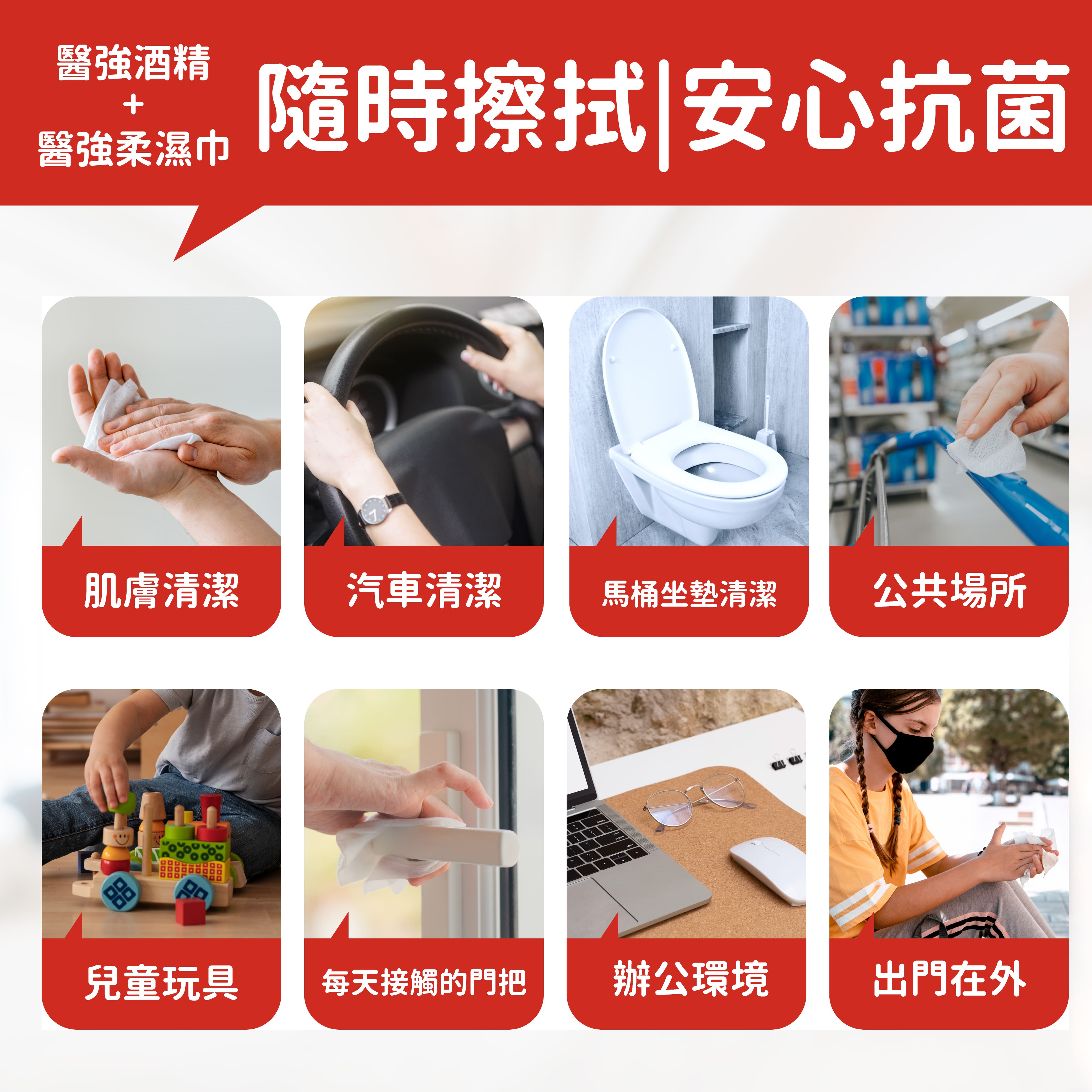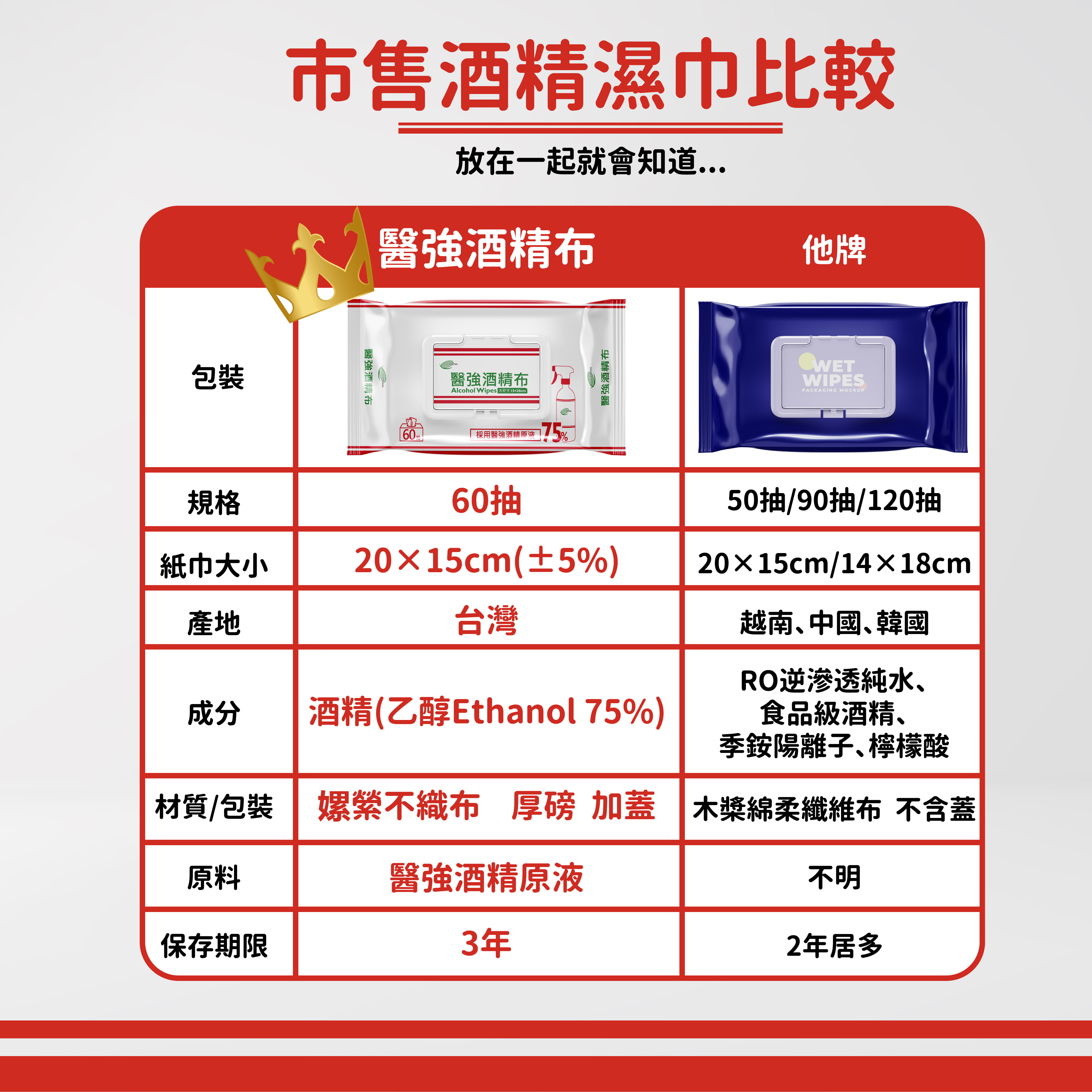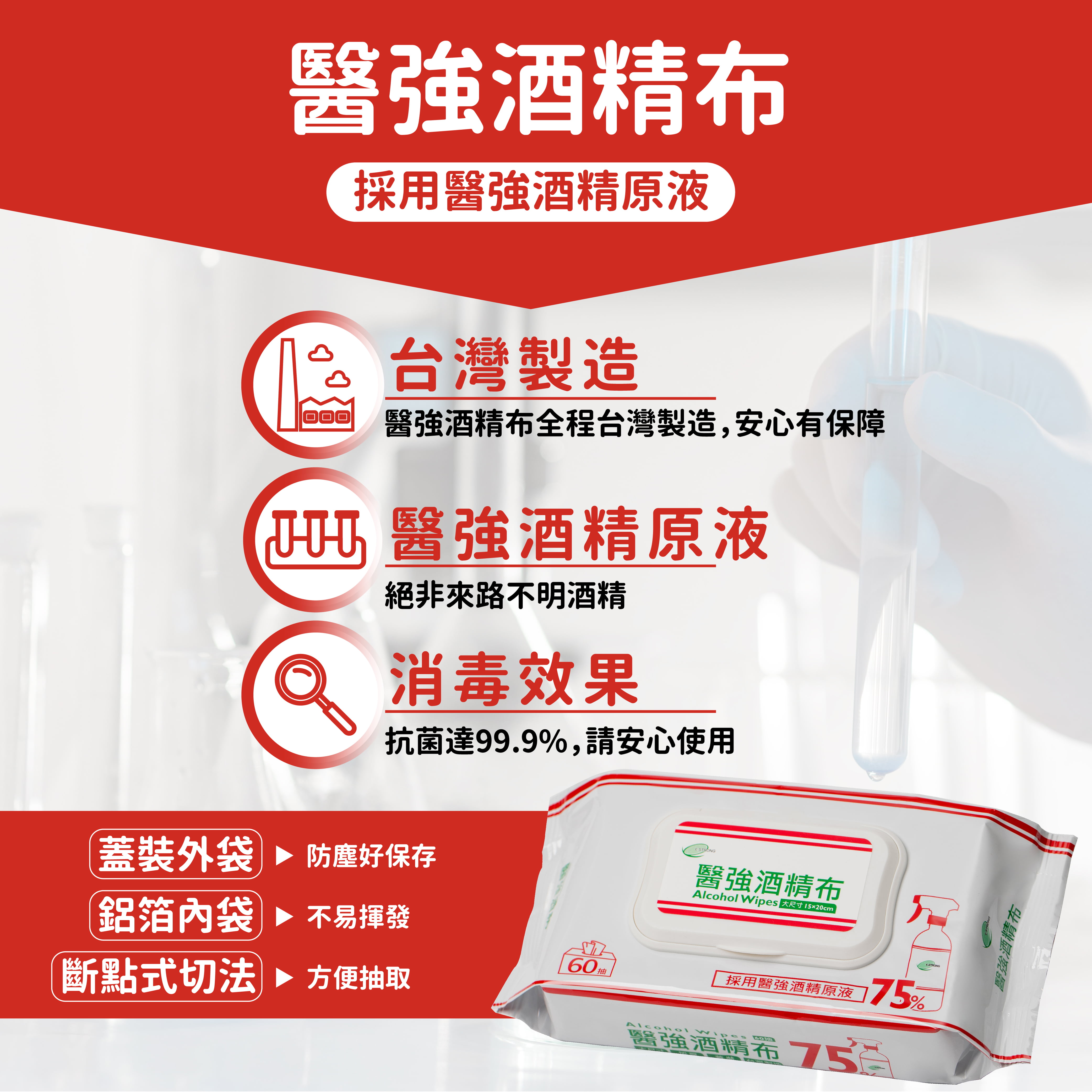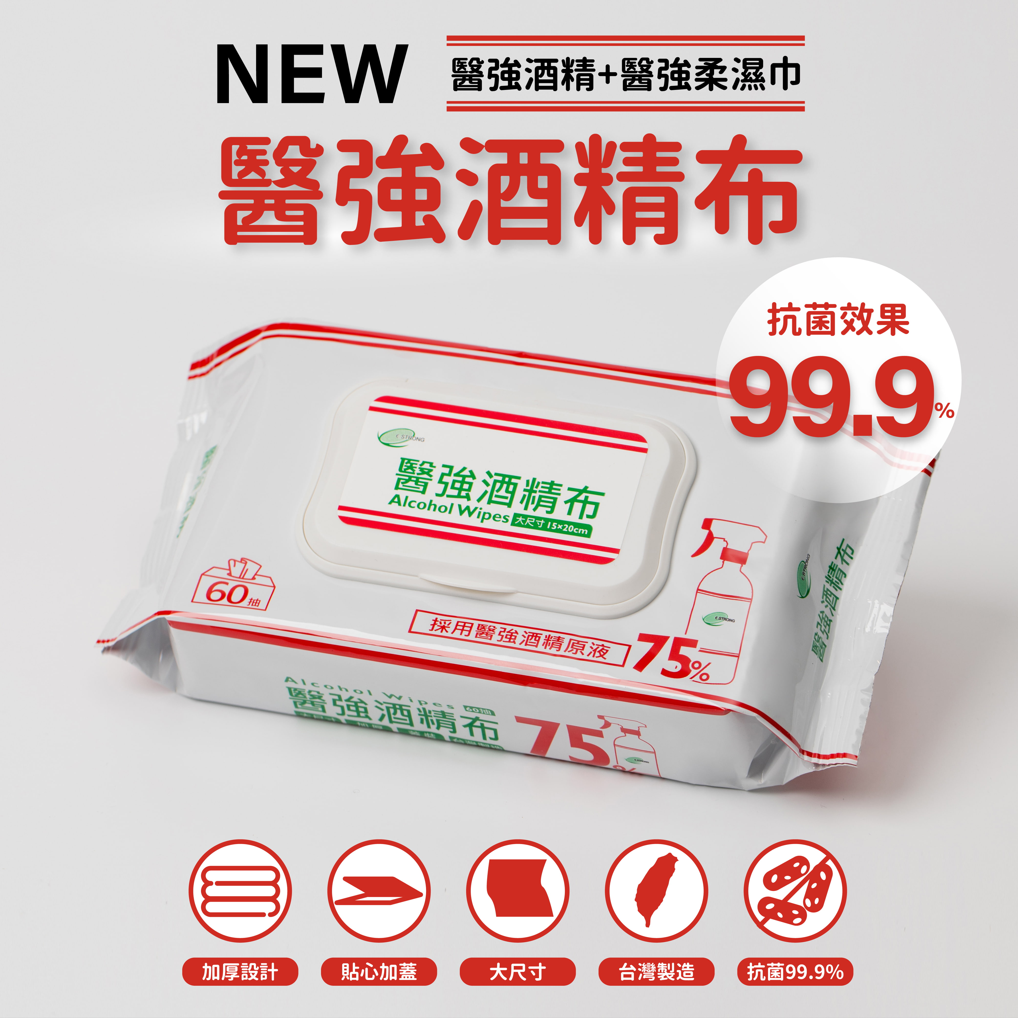 ■品名: 醫強酒精布 60抽■用途: 手部、餐具、桌椅,等日常生活用品清潔■主成份: 嫘縈不織布、酒精(乙醇Ethanol 75%)■規格: 20*15CM (±5%)■抽數: 60抽 (+6%或-2%) / 加蓋醫強75%酒精布 60抽 (蓋裝加厚)全程台灣在地製造,堅持提供最安心的品質!■採用醫強酒精原液 / 75% 好安心保存期限: 3年製造日期: 標示於包裝 (西元年/月/日)保存方法: 請置放於陰涼處、避免高溫或陽光直射注意事項:1.請置放於兒童無法取得處2.勿擦拭眼睛、口腔、傷口或臉部 3.勿擦拭漆品、螢幕及不適乙醇擦拭者4.本品非水溶性,不可丟棄於馬桶內5.肌膚敏感者請先做局部皮膚測試,無過敏反應再行使用6.本產品非藥品,僅供手部清潔、用品擦拭,勿使用於其他用途