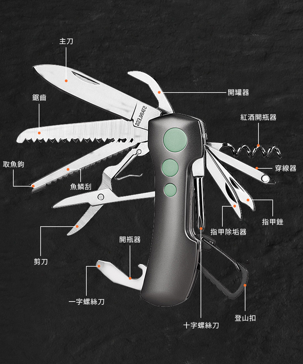 【金永利鋼刀】420不鏽鋼 15合一多功能萬用 折疊瑞士刀 露營用刀