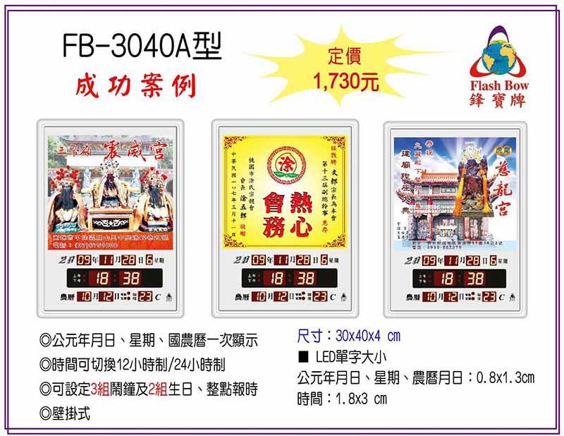 鋒寶牌 壁掛式 電子日曆 數位日曆 萬年曆 30X40X4cm / 台 FB-3040A