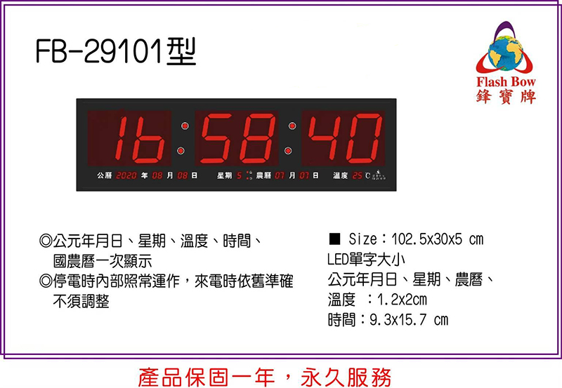 鋒寶牌 數字 電子鐘 萬年曆 橫式 102.5X30X5cm / 台FB-29101