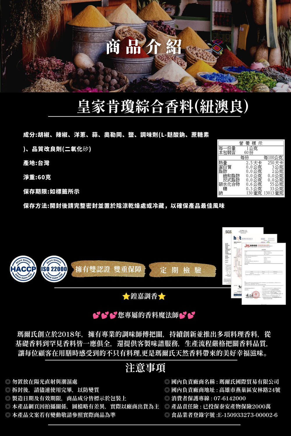 胡椒、辣椒、洋蔥、蒜、奥勒岡、鹽、調味劑(L-麩酸鈉、蔗糖素 )、品質改良劑(二氧化矽)