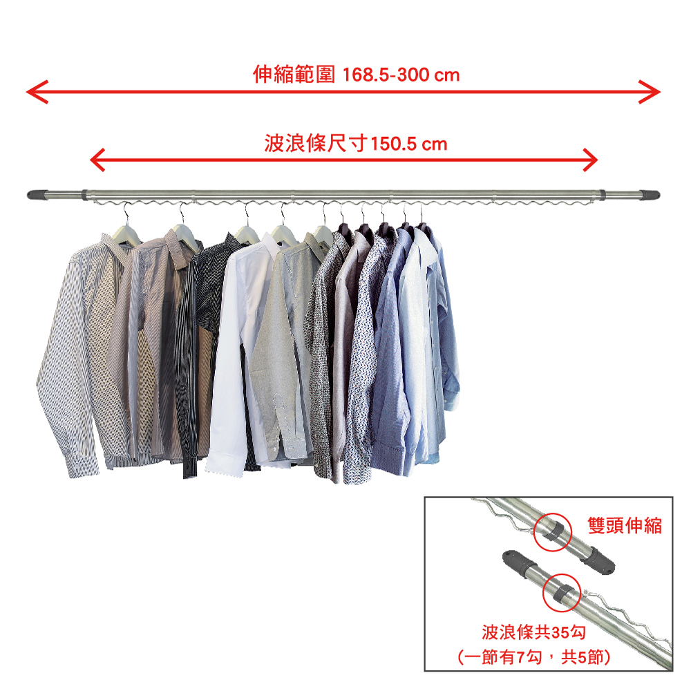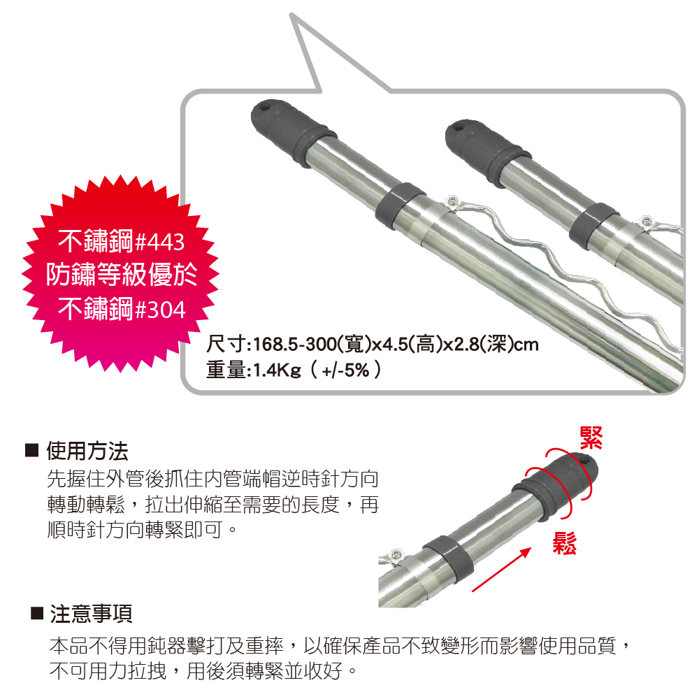 【商品特色】不鏽鋼材質443,抗鏽蝕能力佳波浪條設計,吊掛衣服時不掉落伸縮長度可達約3米【商品規格】尺 寸:168.5-300cm(±5%)材 質:不鏽鋼複合管、塑料伸 縮:雙邊伸縮波浪長度:150cm(共35勾)管 徑:28mm耐 重:約20KG產 地:中國【選購前注意事項,請詳細閱讀】◆請參閱圖片及文案敘述◆銷售不含陳列品◆本賣場提供商品均為實品拍攝;商品顏色依各商品頁中呈現為準。 因每個人使用瀏覽設備(ex.手機、電腦螢幕等)因廠牌/顯示/設定等均不相同,會因此直接影響圖片顏色呈現。顏色以實際商品為準。對於色差或材質敏感的買家,建議直接至實體店面購買,避免造成不必要的糾紛與誤解。#伸縮桿 #曬衣桿 #防風桿