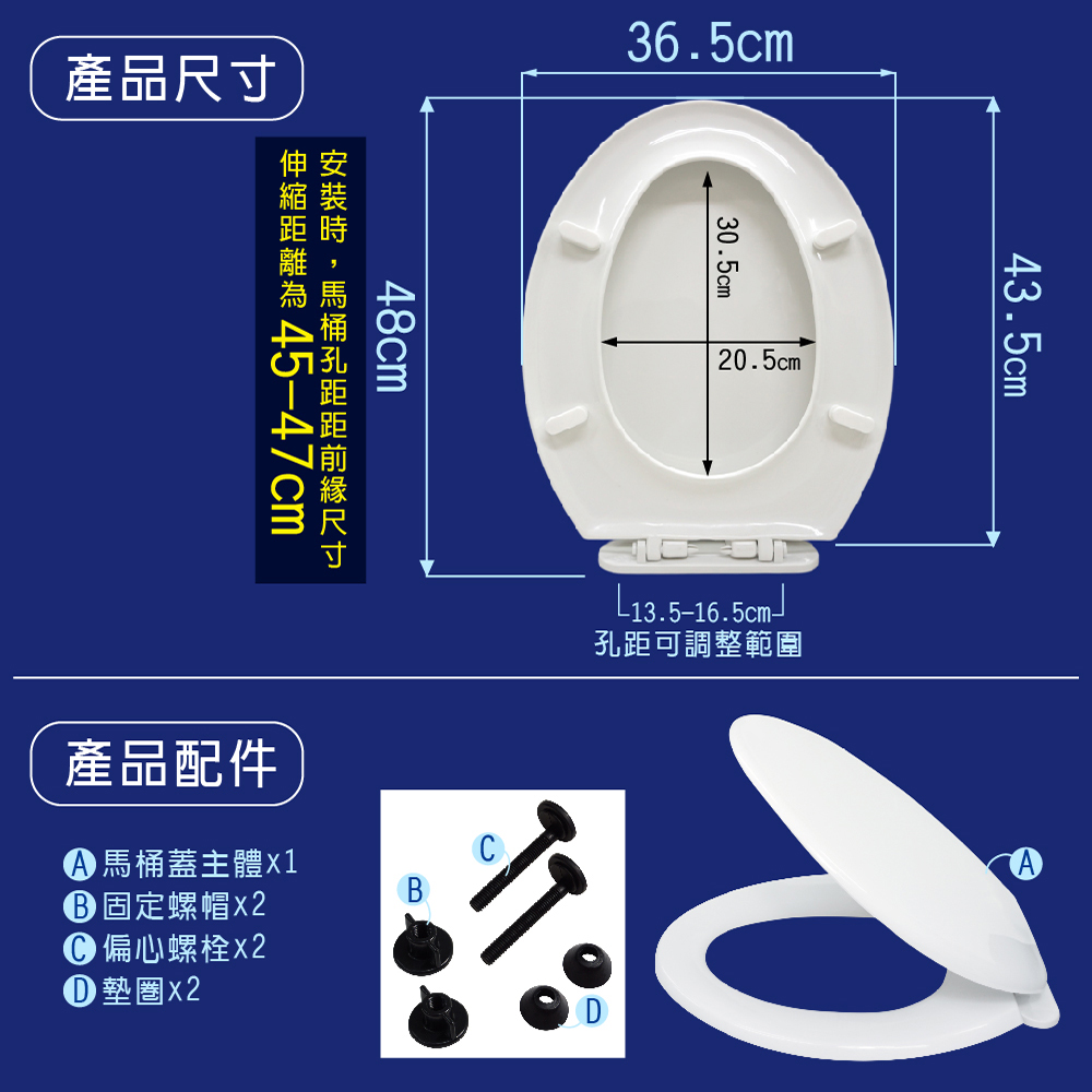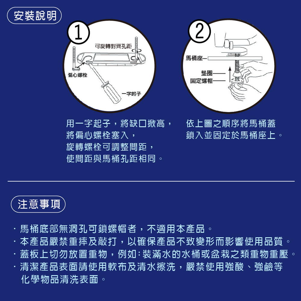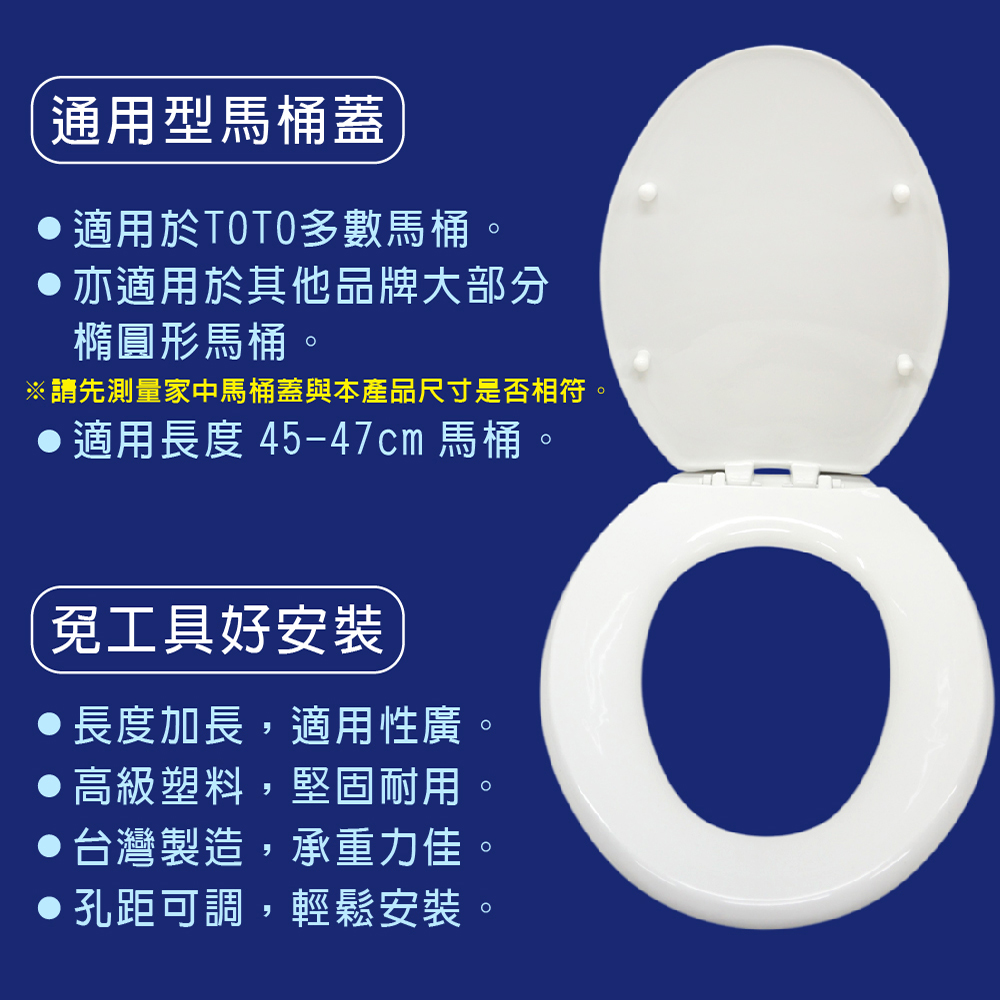 【商品特色】適用大多數TOTO馬桶孔距範圍13.5-16.5cm可安裝長度45-47cm台灣製造 品質優良∕【商品規格】尺寸:長48 x 寬36.5 x 高6 公分材質:PP塑料重量:1.295 kg (±5%)孔距:13.5-16.5cm產地:台灣屬性:DIY產品,需自行安裝※此商品屬於衛生用品,請在購買前確認好商品規格尺寸是否與家中馬桶吻合,若非瑕疵商品,收縮膜經拆封後無法進行退換貨,請知悉※∕【選購前注意事項,請詳細閱讀】◆請參閱圖片及文案敘述◆銷售不含陳列品◆本賣場提供商品均為實品拍攝;商品顏色依各商品頁中呈現為準。 因每個人使用瀏覽設備(ex.手機、電腦螢幕等)因廠牌/顯示/設定等均不相同,會因此直接影響圖片顏色呈現。顏色以實際商品為準。對於色差或材質敏感的買家,建議直接至實體店面購買,避免造成不必要的糾紛與誤解。#加長型 #馬桶蓋 #台灣製 #橢圓形 #圓形 #U型