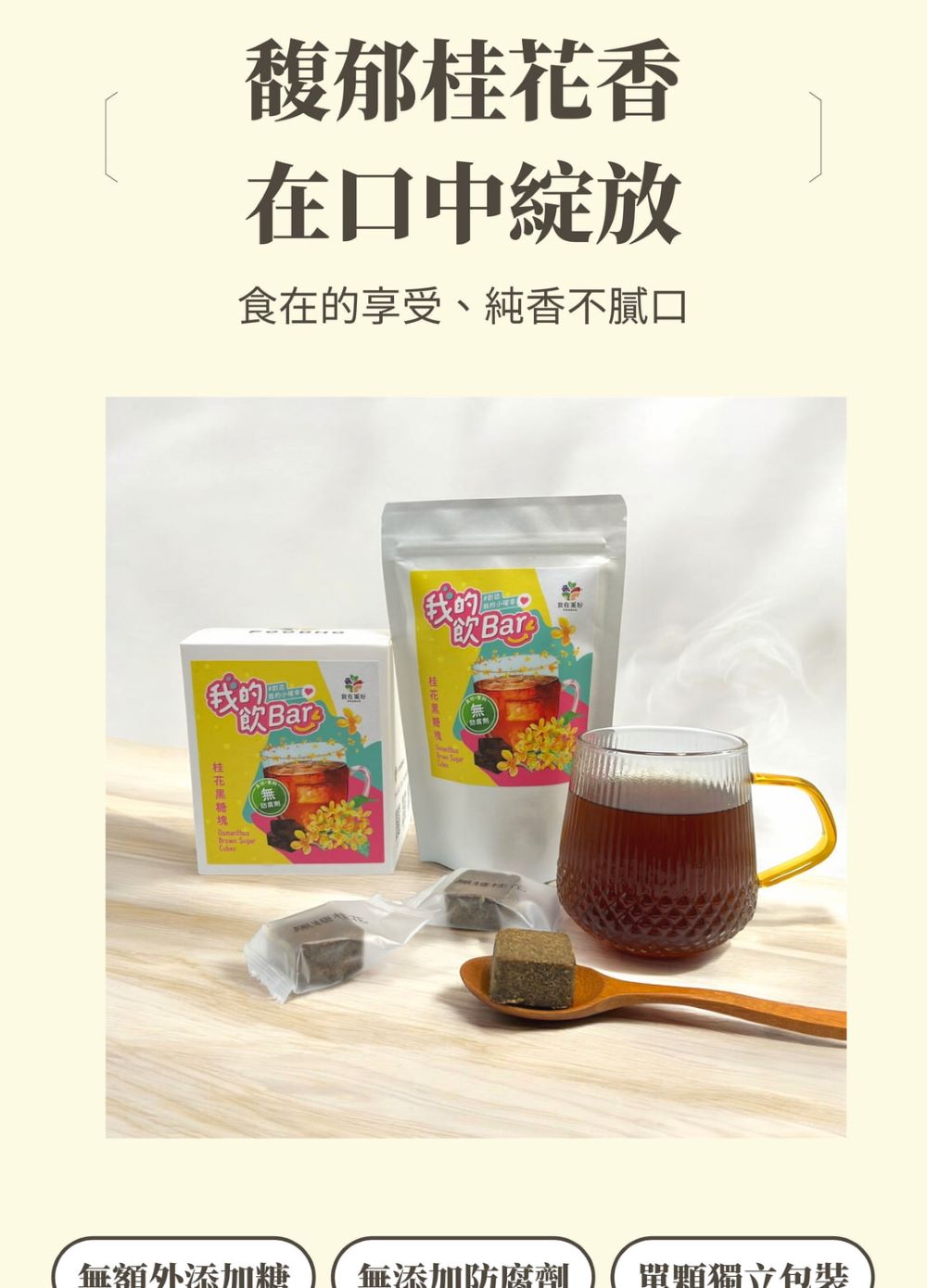 天然純台灣甘蔗製成無添加防腐劑,添加桂花讓您吃得到每一口的真材實料!每一塊黑糖塊都蘊含著濃郁的天然香氣與滋養效果,都能為您的生活增添一份健康與美味。 品名:食在美好FOODHO™桂花黑糖塊淨重:17g成分 :黑糖、桂花、香料保存期限:一年(2026/2/18)食用方式:以200cc~300cc熱水沖泡1顆品名:食在美好FOODHO™雪耳枸杞黑糖塊2入淨重:17g成分 :黑糖、白木耳、枸杞保存期限:一年(2026/2/14)食用方式:以200cc熱水沖泡1顆