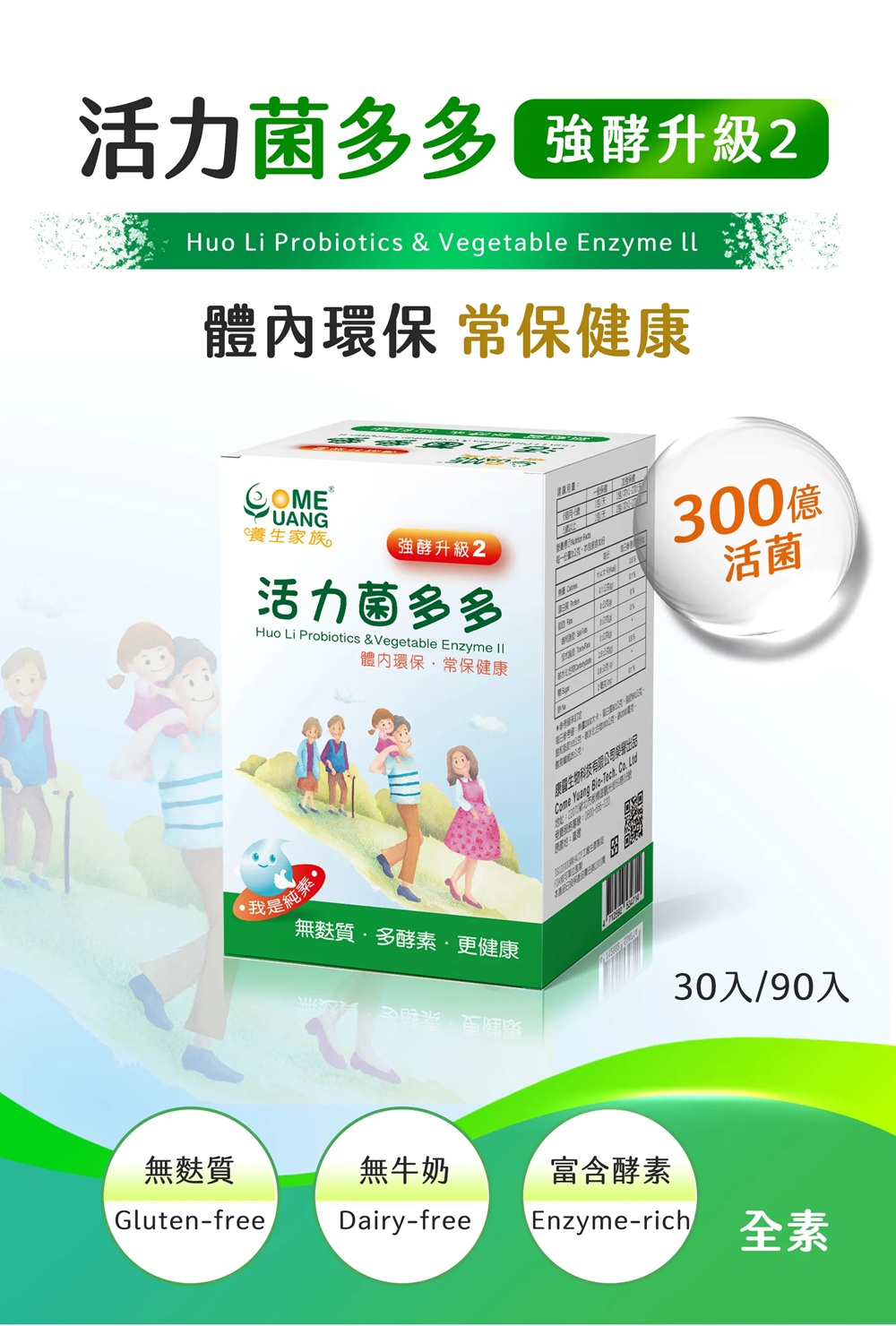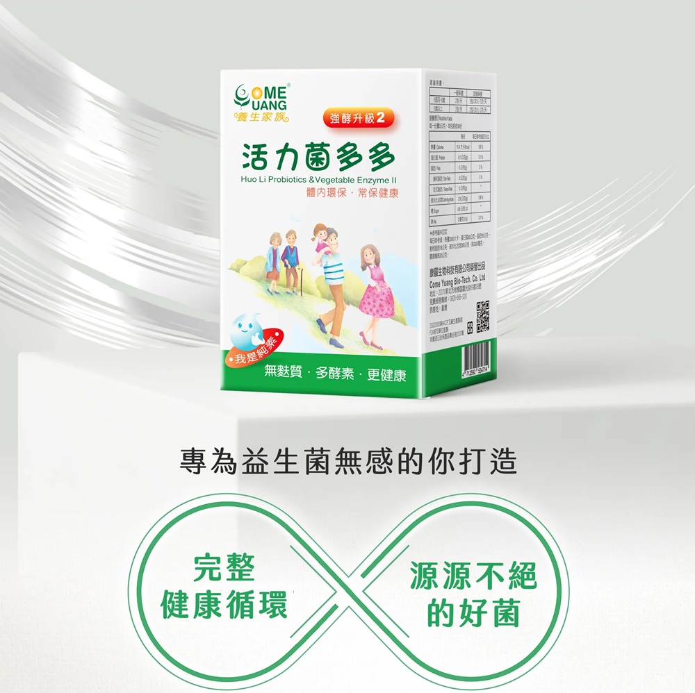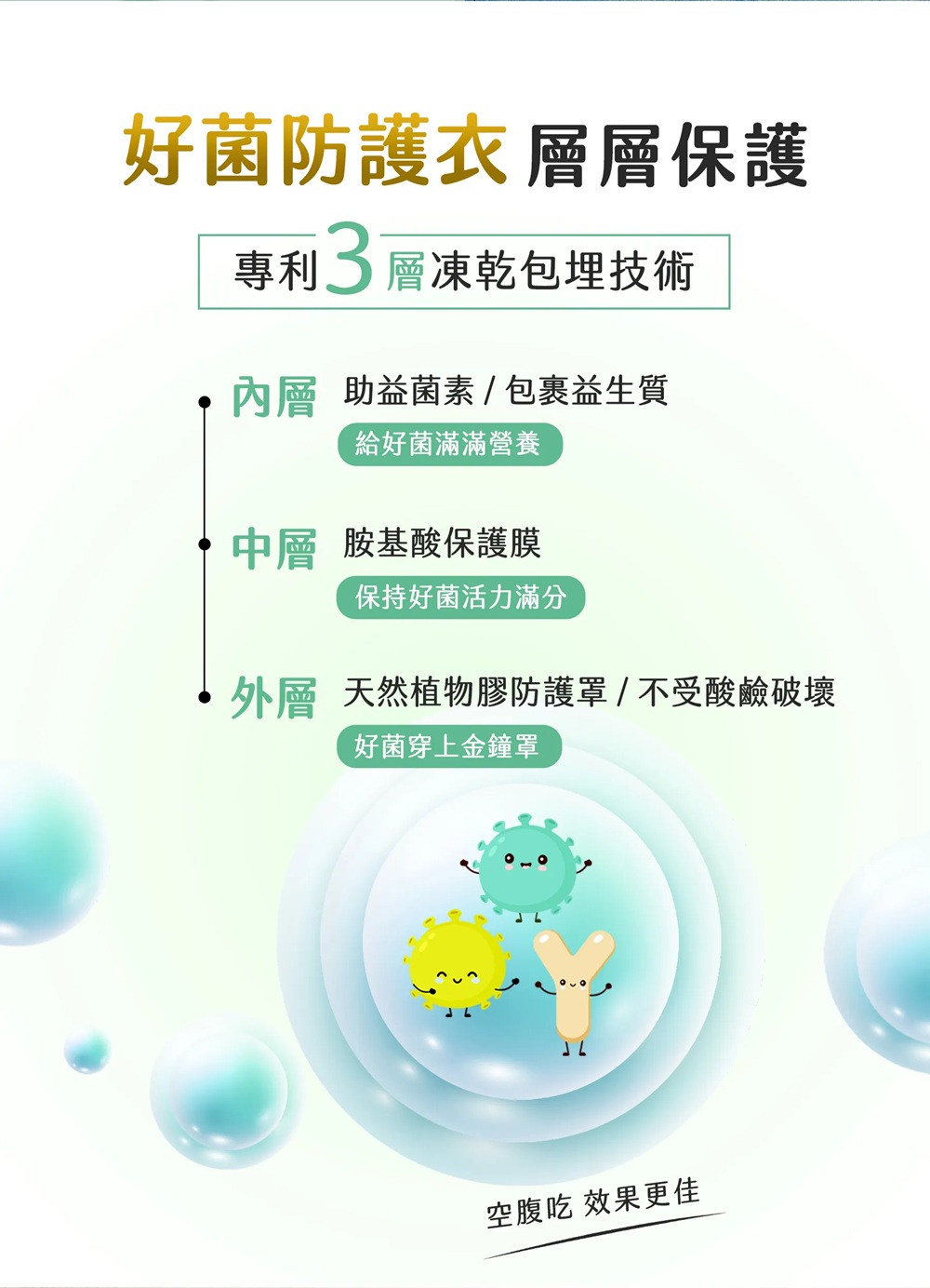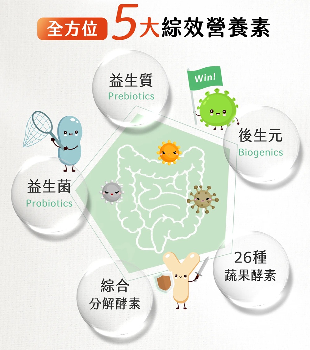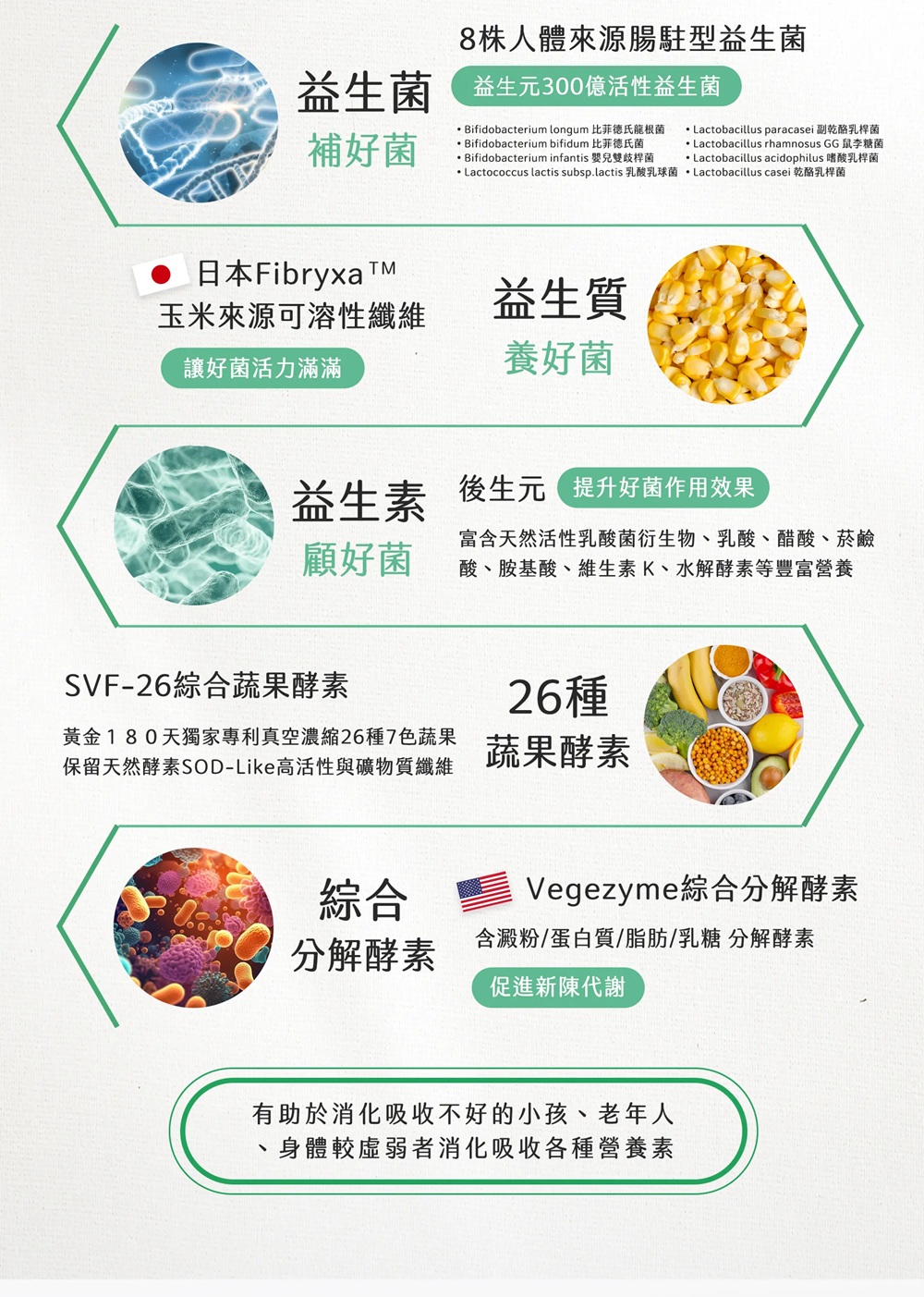 全方位5大綜效營養素與專業乳酸菌馴養技術◎八株人體來源腸駐型益生菌! 300億活性乳酸菌(Probiotics) + 益生質(Prebiotics) +益生素(Biogenics益生菌發酵營養素: 乳酸、醋酸、胺基酸、短鏈脂肪酸與維生素)◎添加綜合蔬果酵素(26種蔬果經180天精緻發酵.含SOD-LIKE)+綜合分解酵素◎共生發酵馴養技術! 多層奈晶胜肽包埋技術 保護乳酸菌通過胃酸膽鹼!◎無麩質基底! 不含牛奶成分!◎幫助維持消化道機能、改變細菌叢生態、使排便順暢。