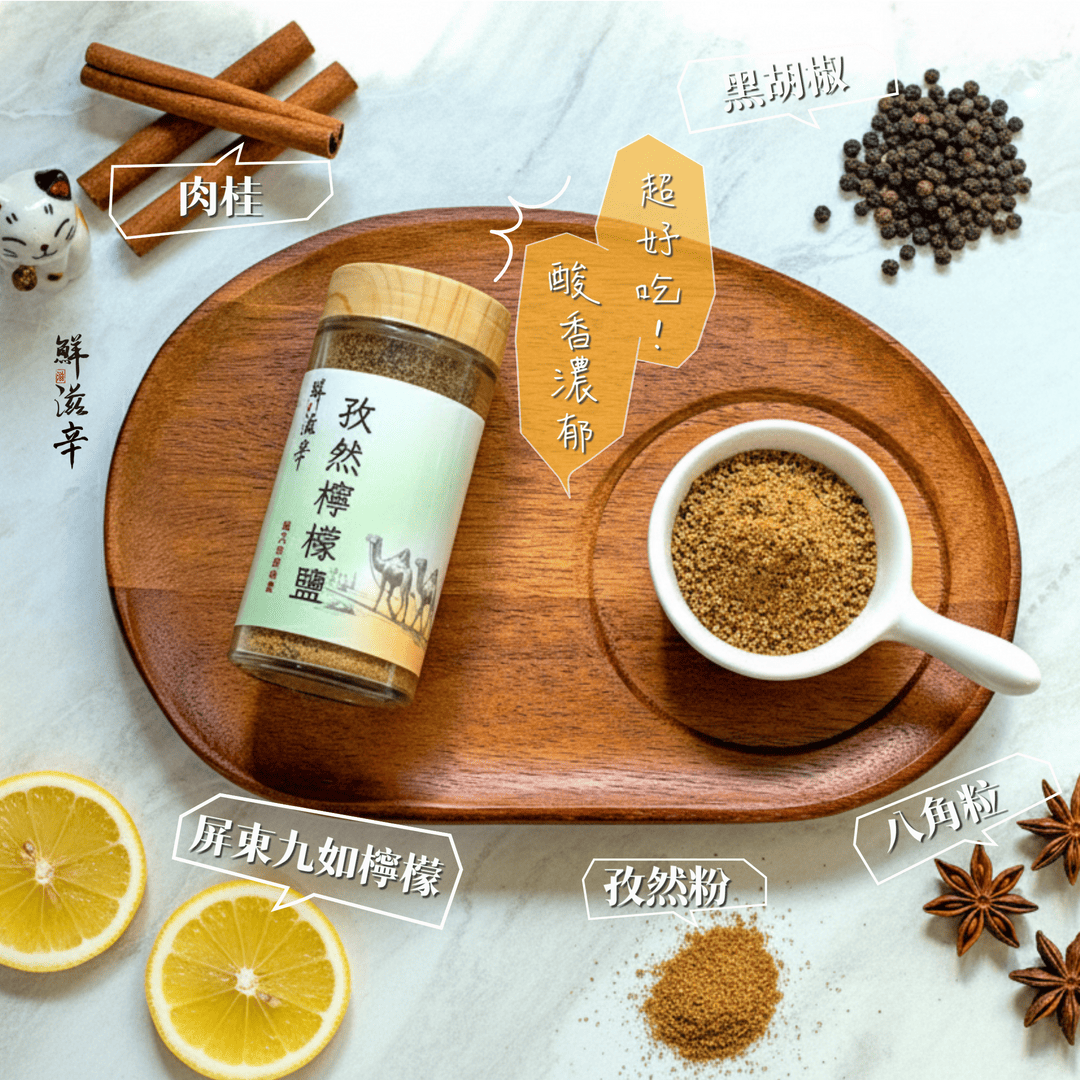 全新獨特口味孜然檸檬鹽上市!燒烤炸物新選擇好吃永不膩!使用屏東九如高品質新鮮檸檬現榨,保有完整檸檬酸爽香氣,與燒烤當紅孜然粉完美特調併出新滋味。味道獨特濃厚、香氣十足又清爽解膩。適合搭配燒烤、炸物、輕食水煮料理,酸香好滋味讓料理提升新境界!