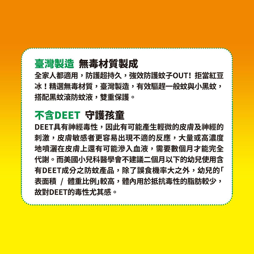 ◆孕婦及幼童適用◆貼在衣物或背包上◆歐洲頂尖萃取技術◆多項SGS檢驗合格◆採用歐洲進口天然驅蚊成份PMD,不含化學成份DEET規格:直徑4cm主要成分:檸檬尤加利精油(OLE) / 檸檬桉醇(PMD)台灣生產製造