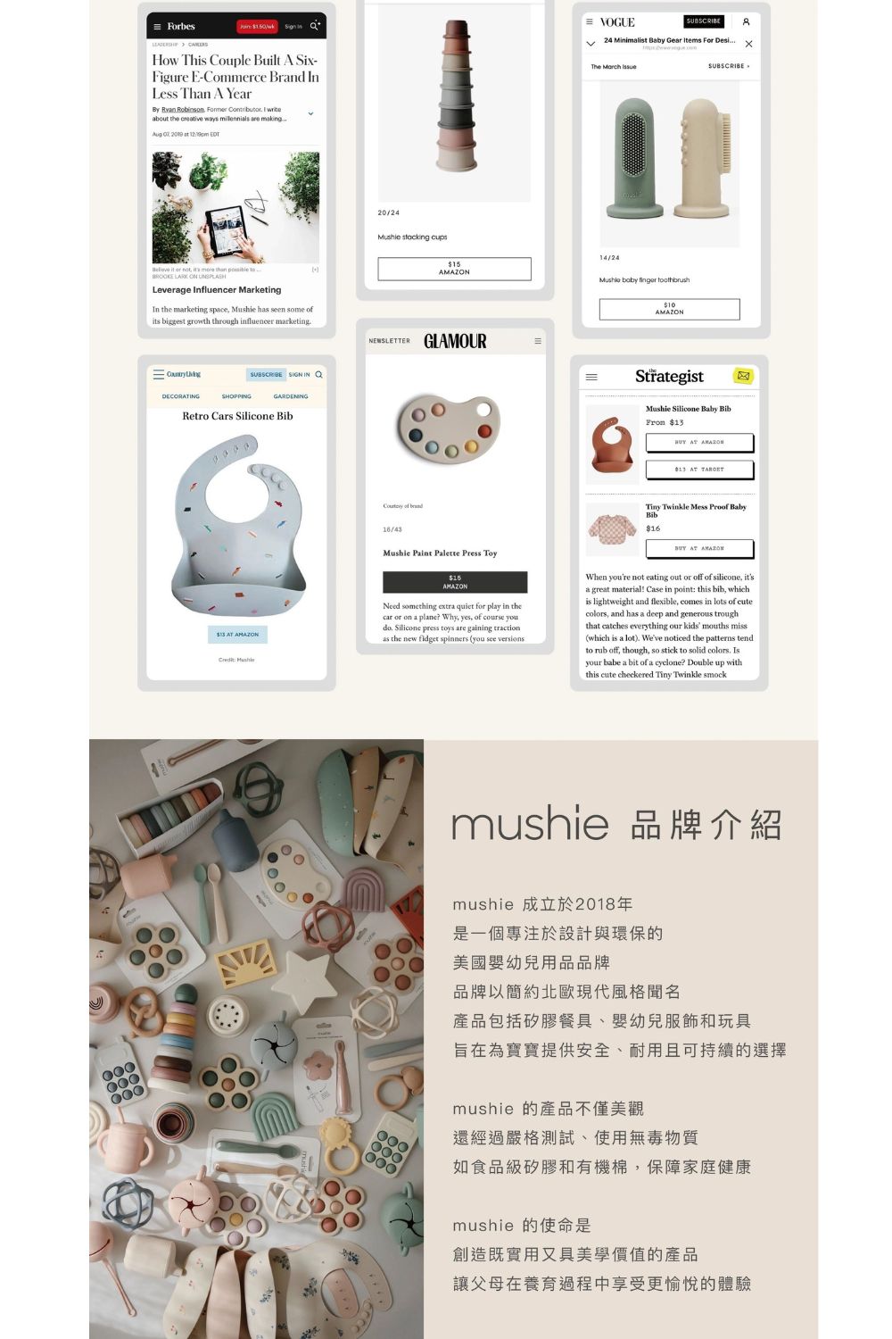 Mushie & Co 是來自 美國 的高品質嬰兒用品品牌,靈感源自 北歐丹麥的極簡育兒哲學。 由一對夫妻創立,Mushie 致力於打造 安全、天然、兼具設計感 的產品,陪伴寶寶的成長每一步。 從圍兜、奶嘴、餐具到生活配件,Mushie 所有產品皆強調 實用、優雅、無毒。
