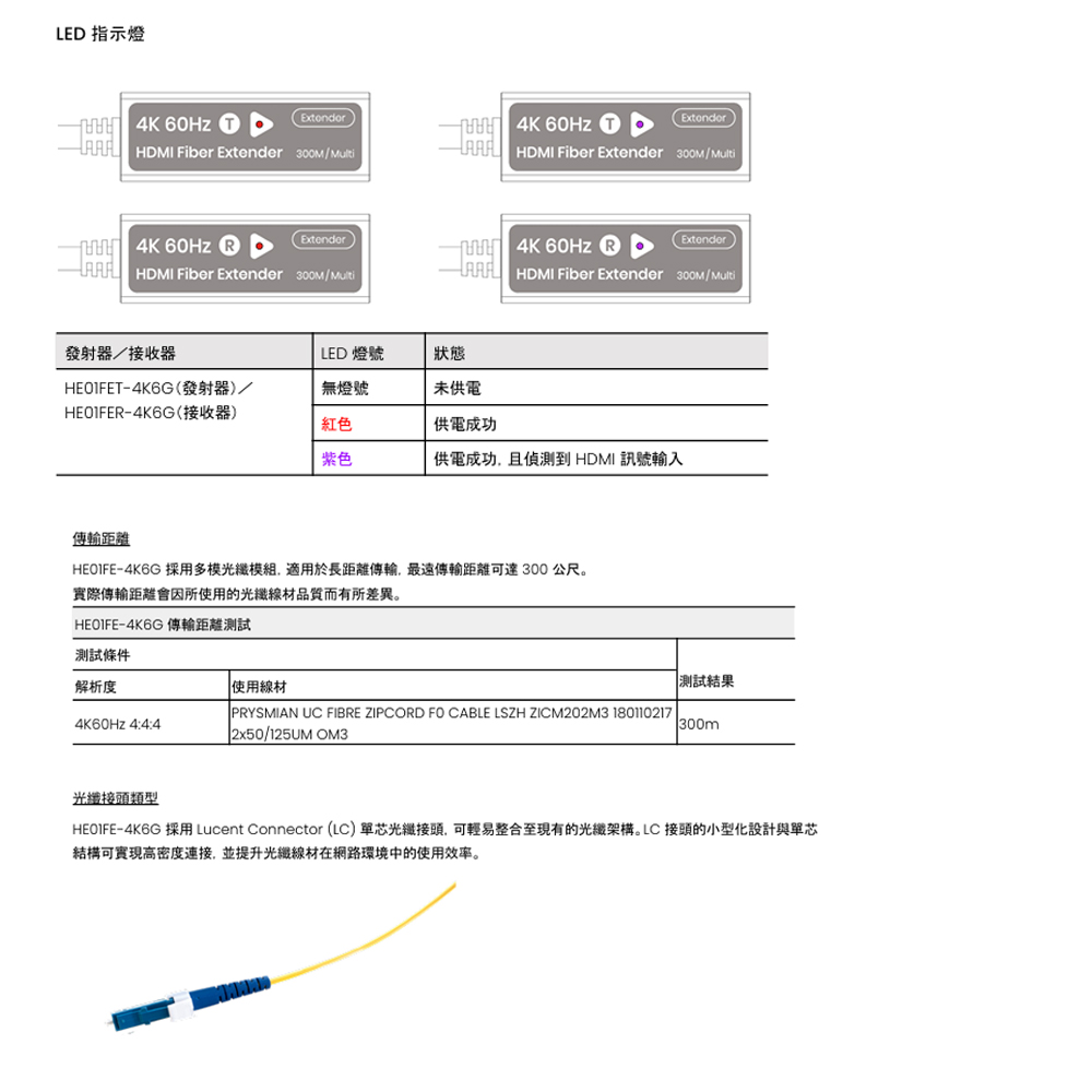 -HE01FE-4K6G 是一款 HDMI® 延長器,可透過 LC 接頭連接一條多模光纖線,將未壓縮的 4K60Hz HDMI® 訊號傳輸至遠端,同時支援 EDID 及 HDCP 直通。