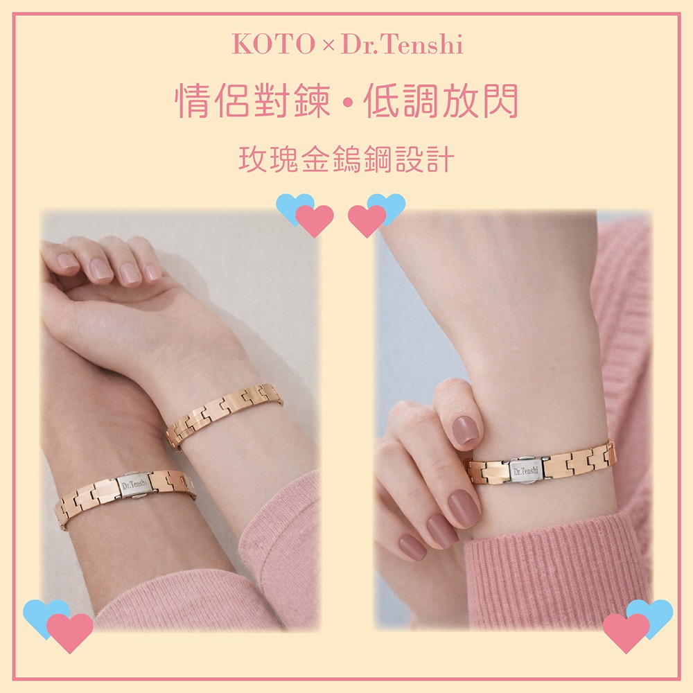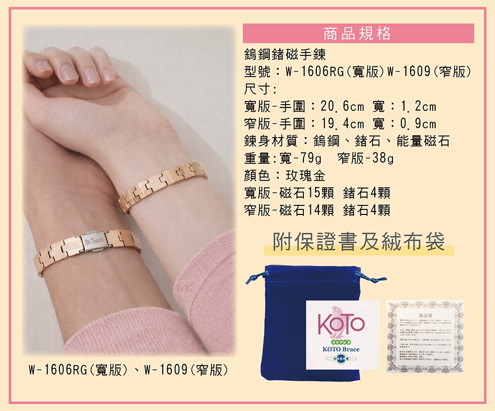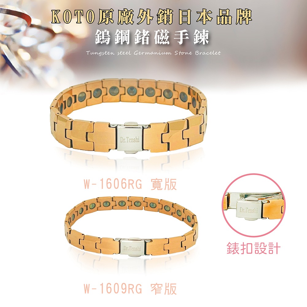 -品名:日本熱銷KOTO原廠限量款Dr. Tenshi 鍺磁能量鎢鋼手鍊 玫瑰金情侶對鍊型號:W-1606(寬版)、W1609(窄版)寬版-手圍:20.6cm 寬:1.2cm窄版-手圍:19.4cm 寬:0.9cm鍊身材質:鎢鋼、鍺石、能量磁石重量:寬-79g 窄版-38g 顏色:玫瑰金寬版-磁石15顆 鍺石4顆窄版-磁石14顆 鍺石4顆