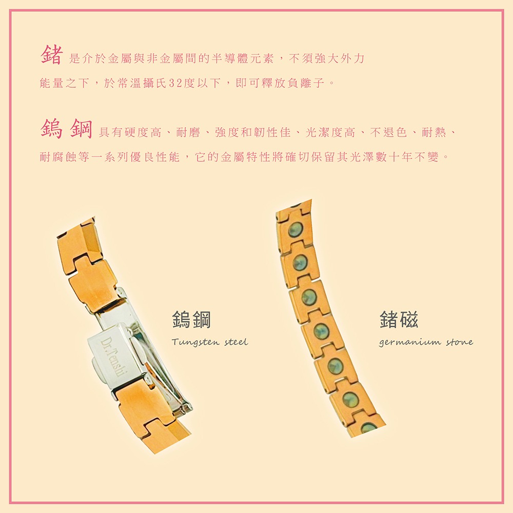 正面是玫瑰金脈動錢進波形、背面鑲有鍺石和磁石雙重元素、能量養生手鍊。Dr. Tenshi 鎢鋼手鍊結合堅硬耐磨的鎢鋼工藝美學與鍺石、磁石的健康元素。鍊身設計如齒輪般造型的幾何鏈結與玫瑰金質感,形成脈動波段、往前源源推進、能量迴路、代表能量在手腕間不斷循環,生生不息。鍺石和磁石雙元素的守護與屏障、如同隱形護盾般守護佩戴者健康與磁場、玫瑰金曜眼奪目,尊貴金屬質量與能量的和諧、寓意身上磁場達到相應平衡、展現動靜皆宜的養生現代感。
