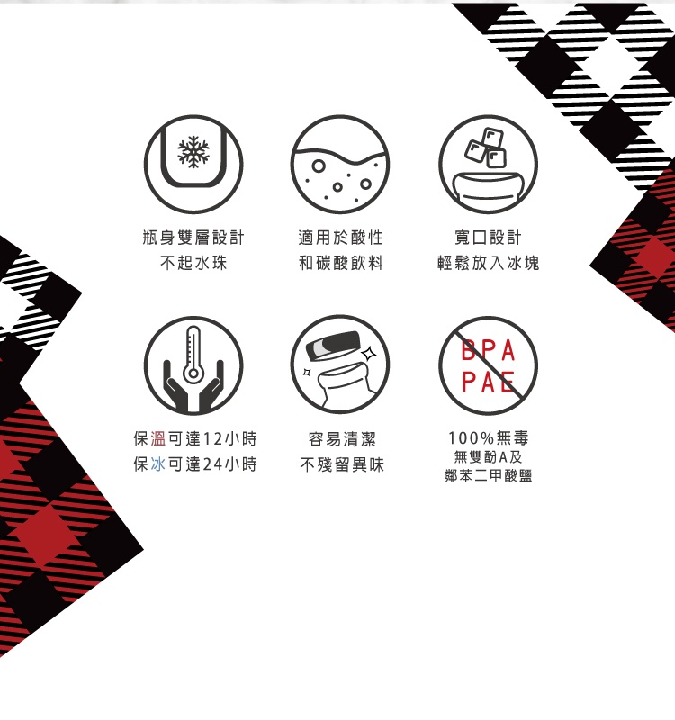 瓶 - 304不鏽鋼(18/8 Stainless Steel) 蓋 - 304不鏽鋼(18/8 Stainless Steel)、矽膠(Silicone)容量:500ml淨重:275g耐溫:100℃原產地:中國(ISO9001、ISO14001及OHSAS18001認證工廠)【使用注意事項】* 如欲加強保溫效力,可注入少量熱(冰)水預溫1分鐘後倒出,再重新注入熱(冰) 水,即可加強保溫效力。* 請避免摔落或強力碰撞,避免撞傷受損進而影響保溫效力。* 請勿使用電鍋、微波爐、蒸烤爐、烤箱或其他任何加熱器具加熱,避免造成真空層受損,影響保溫效力。* 切勿置於冷藏室與冷凍庫,避免冷縮效應造成真空層損壞,進而影響保溫效力。* 本品採用高潔淨研磨處理無鍍膜,可盛裝碳酸與酸性飲品。* 盛裝碳酸飲品時請勿盛裝過滿及避免晃動,以免氣體導致杯內氣壓過高無法開啟或杯蓋爆開、內容物噴出等危險。* 盛裝奶類製品等易腐敗飲品,請儘速飲用完畢,避免因溫度變化而產生變質導致滋生細菌、發酵敗壞。* 小朋友使用時,請勿裝入過熱飲品,以避免導致燙傷。【清潔&收納注意事項】* 請手洗清潔,切勿置於洗碗機清洗或烘碗機內烘乾,避免熱脹冷縮效應,造成真空層損壞,影響保溫效力。* 請使用海綿或濕布清潔,不可使用菜瓜布、鋼刷等硬質刷具,以免造成瓶身烤漆脫落。* 清潔瓶內時請使用海綿或濕布,切不可使用菜瓜布、鋼刷等硬質刷具,以免瓶內刮傷受損,易造成細菌滋生。