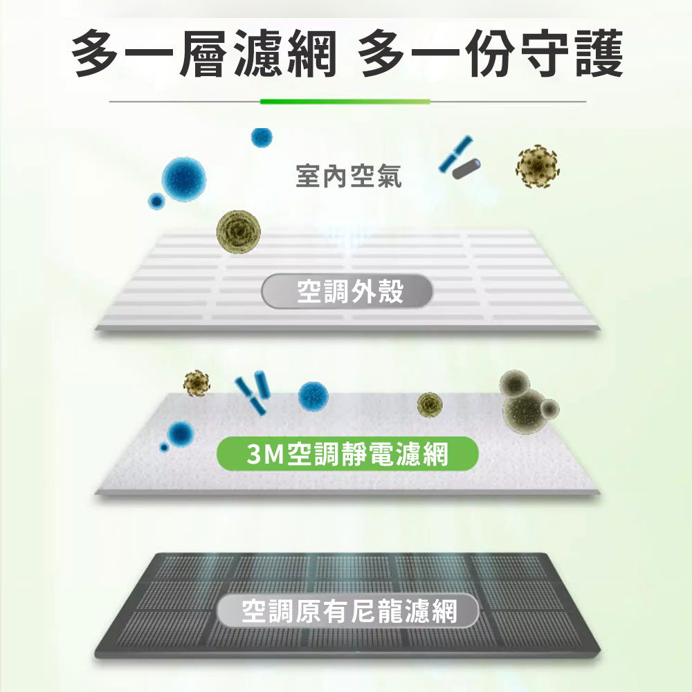 ◆濾網多一片,乾淨空氣看得見!3M靜電空氣濾網,採用3M特殊靜電技術及製程,超細纖維上施加永久正負電荷靜電處理,高效過濾微塵、塵蹣、黴菌、花粉等空氣中細懸浮微粒,讓家中冷暖空調兼具小坪數空氣清淨機之濾淨能力。