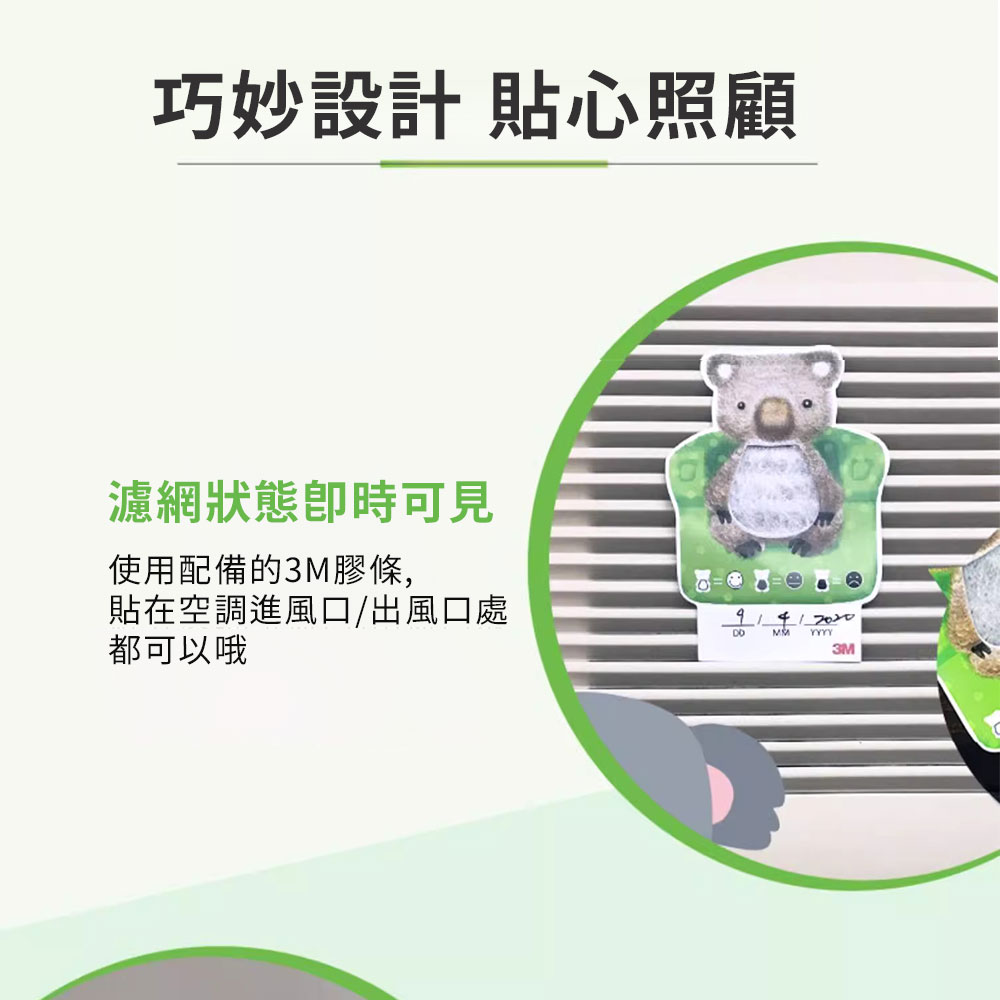 ◆內容物:靜電空氣濾網1捲、3M膠貼3片(12小條/片)、無尾熊濾網更換指示卡3片