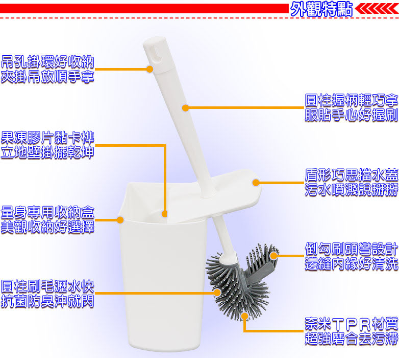 簡約時尚,流線設計,空間收納。 無痕黏貼節約空間,簡單掛壁無痕安裝。 雙頭TPR材質,防臭不沾黏,馬桶溝縫,清潔好方便。