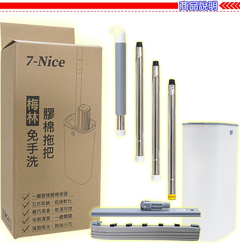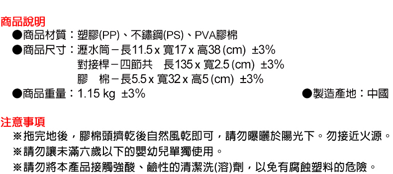 商品材質:塑料PP、不鏽鋼、PVA膠棉商品尺寸:瀝水桶-長11.5cm x 寬17cm x 高38cm ±5%4節對接桿-長135x2.5cm±5%膠棉-長5.5cmx寬32cm±5%重量:1.15kg±5%保存期限:未拆封15年製造產地:中國浙江
