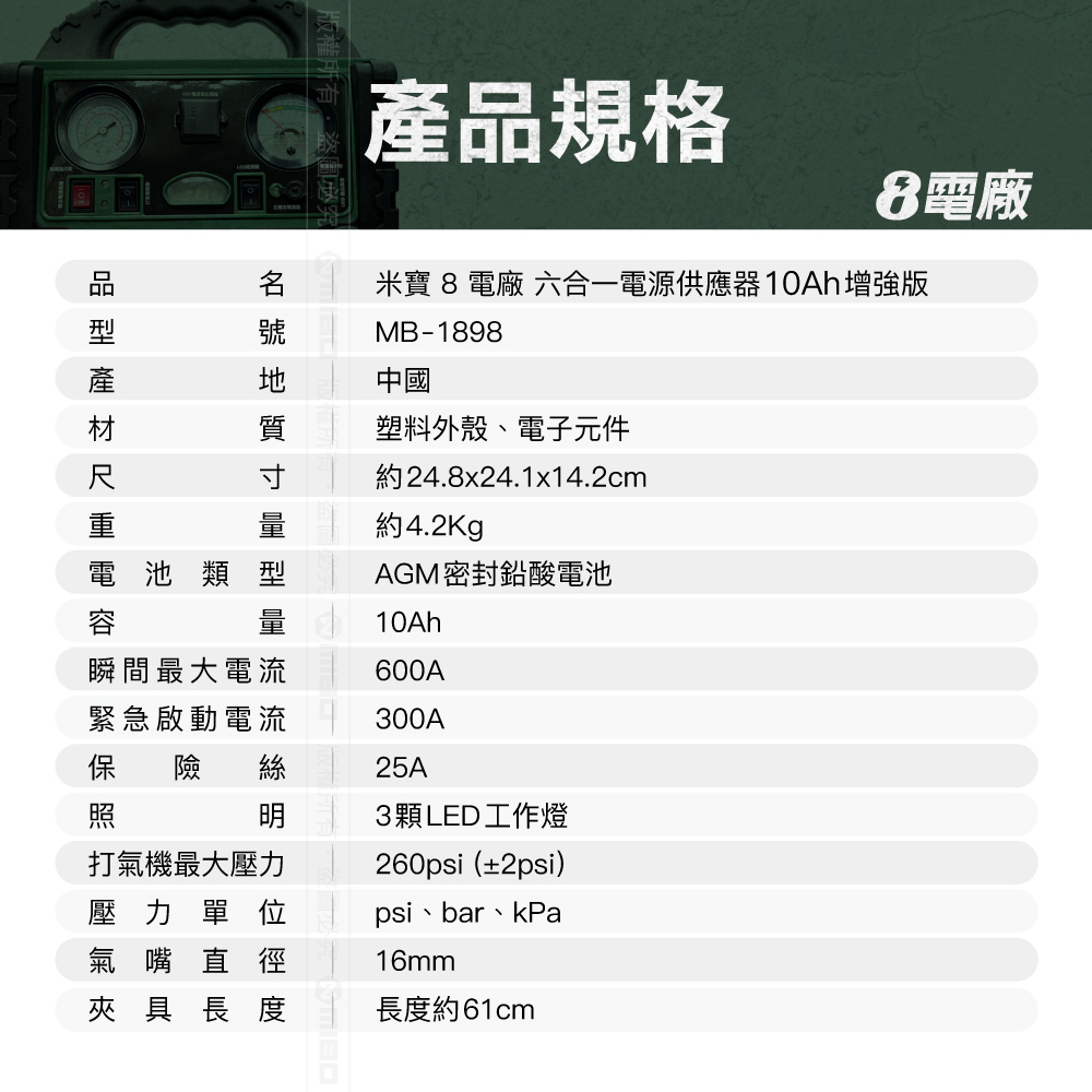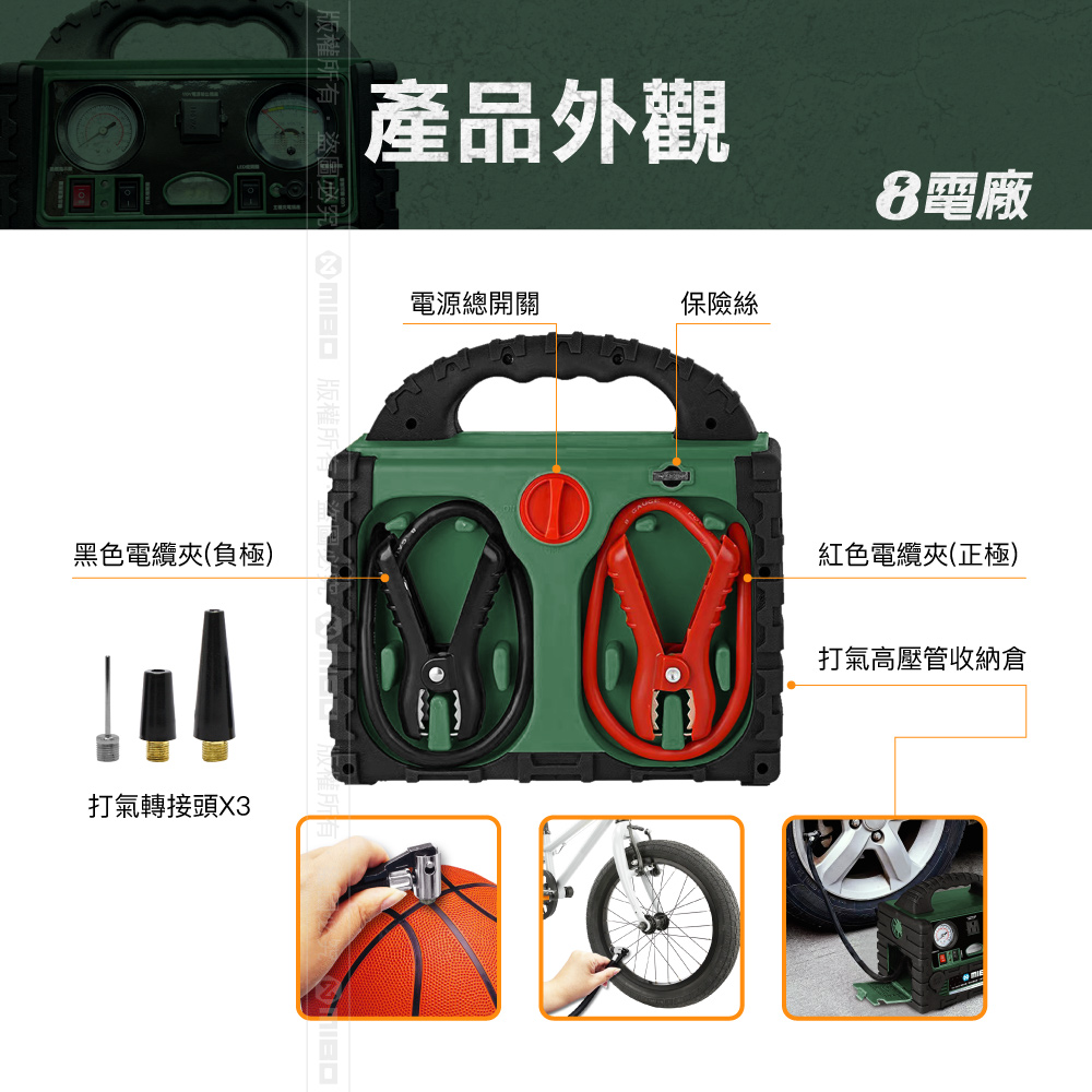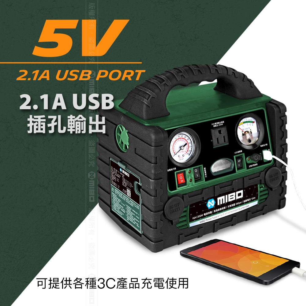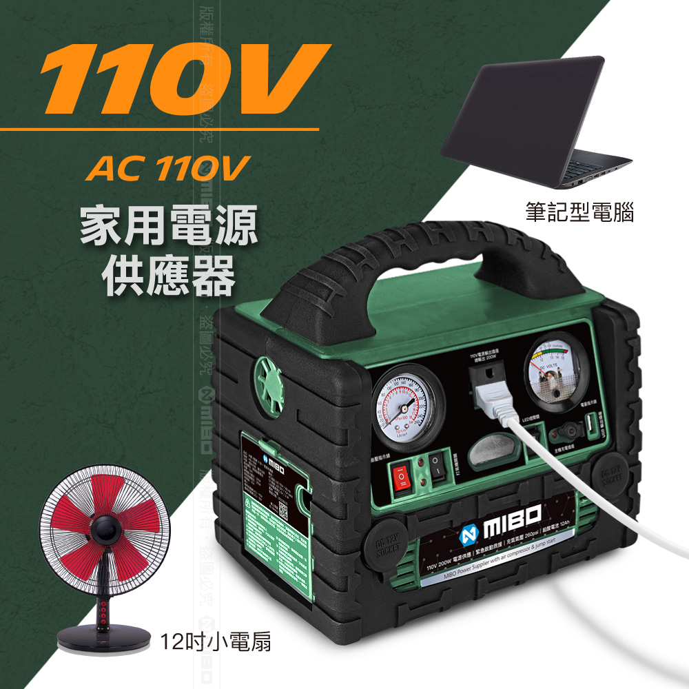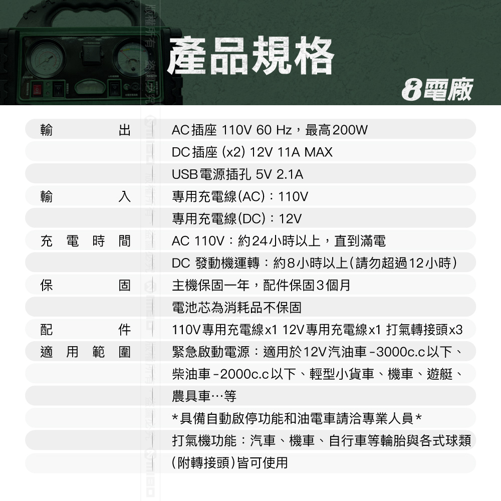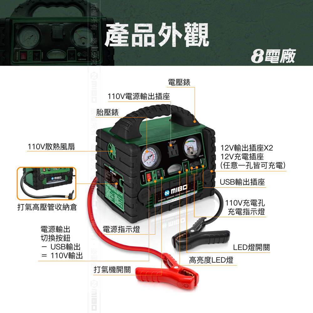 👍110V插座、緊急照明、汽車緊急發動、車用打氣機、USB電源輸出、12V電源輸出。