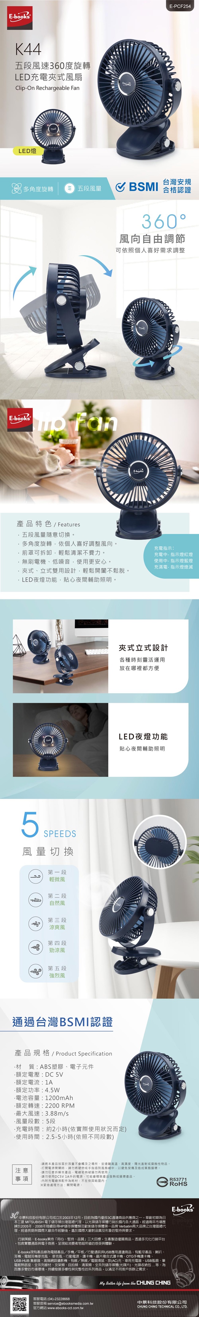 E-books K44 Clip-On Rechargeable Fan