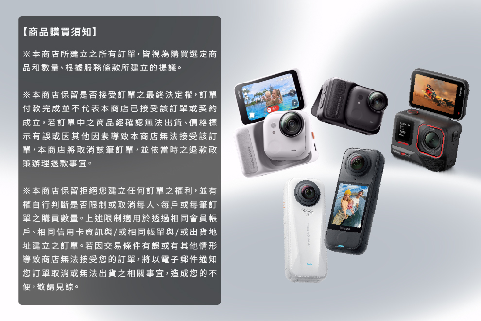 ※本商店保留拒絕您建立任何訂單之權利,並有權自行判斷是否限制或取消每人、每戶或每筆訂單之購買數量。上述限制適用於透過相同會員帳戶、相同信用卡資訊與/或相同帳單與/或出貨地址建立之訂單。若因交易條件有誤或有其他情形導致商店無法接受您的訂單,將以電子郵件通知您訂單取消或無法出貨之相關事宜,造成您的不便,敬請見諒。