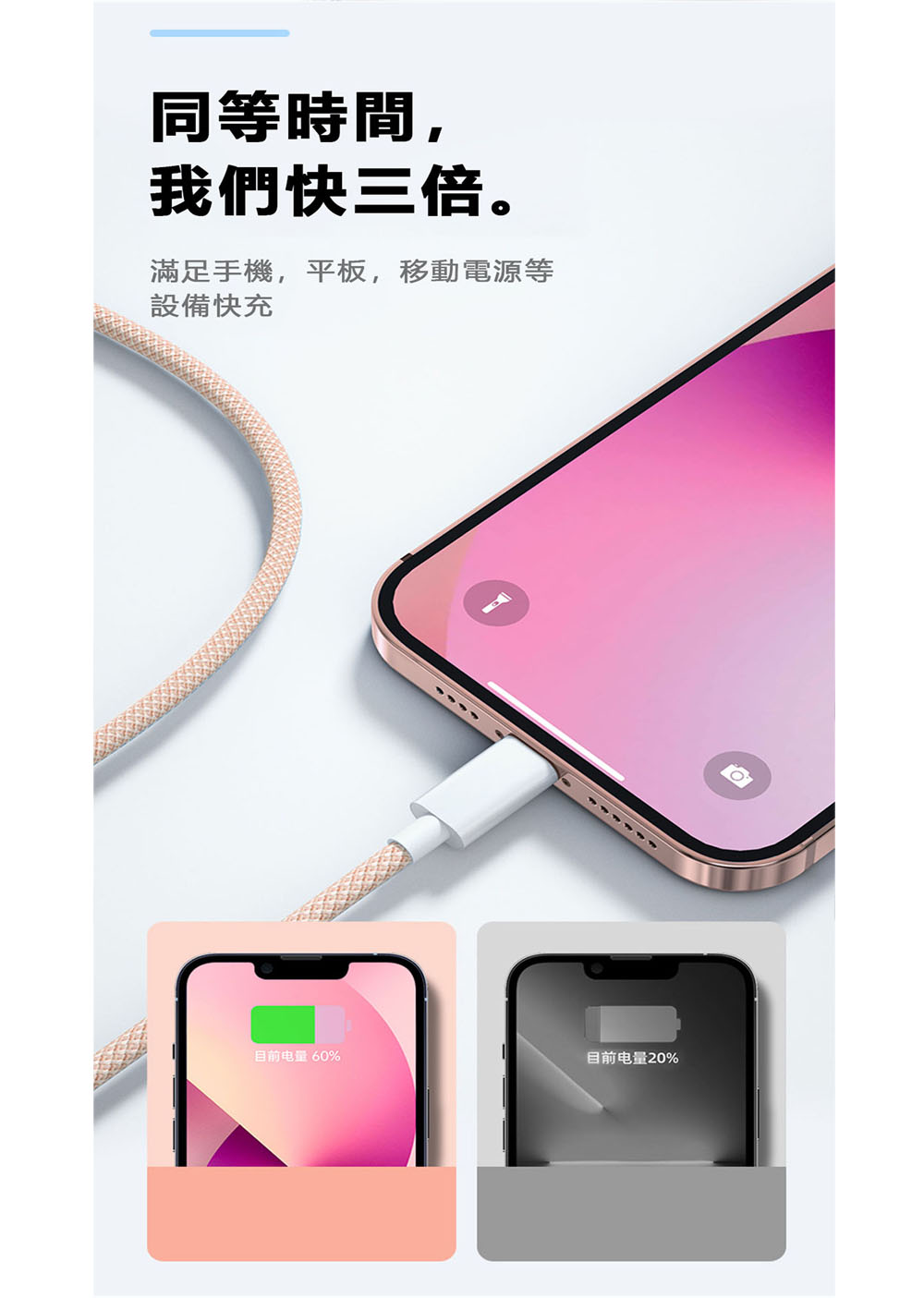 同級首選耐用標杆|快充 + 耐用雙頂配不只快充、更耐用,我們的充電線直接成為同級耐用與效率的雙標杆:⚡ 60W PD/QC 雙協議疾速快充🧵 高密編織耐用材質📏 1m 自由長距體驗🎨 多色可選(多色顏值款)⚡ 疾速快充 + 同步傳輸|效率直接拉滿支援 PD/QC 雙快充協議,30 分鐘約充設備 60% 電量;同時支援充電 + 數據傳輸,速度達 480Mbps,充電、傳文件同步進行,不用再分先後。全機型適配:支援iPhone/華爲/小米等設備(PD 快充),不挑機、插即充。✨高密編織耐用王|壽命是普通線的 6 倍採用高密編織工藝,耐磨防刮、抗弯折性遠超普通塑膠線;反覆彎折不易斷裂、日常磨損不易破損,長期使用依舊穩定耐用,告別「用幾次就壞」的煩惱。📏多色高顏值|體驗與美觀兼備,多色高顏值:多種清新顏色搭配編織紋理,簡約耐看還不易髒,不管搭配手機還是充電寶,都是日常使用的顏值加分項。🔒 安全認證 + 自收納|穩定不踩雷全兼容原廠認證標準,充電穩定不發燙,有效保護設備電池壽命;支援自卷 / 自收納設計,不用時輕鬆整理,告別線體纏繞雜亂。🌟 為什麼幾乎所有使用者都選我們?✅ 60W 快充同級效率最高:疾速充電 + 同步傳輸雙在線✅ 耐用性首選:高密編織壽命是普通線的 6 倍✅ 使用最靈活:1m 距離使用靈活✅ 全機型適配:不挑蘋果 / 安卓設備✅ 長期使用最穩定:不斷線、不發燙、體驗不打折
