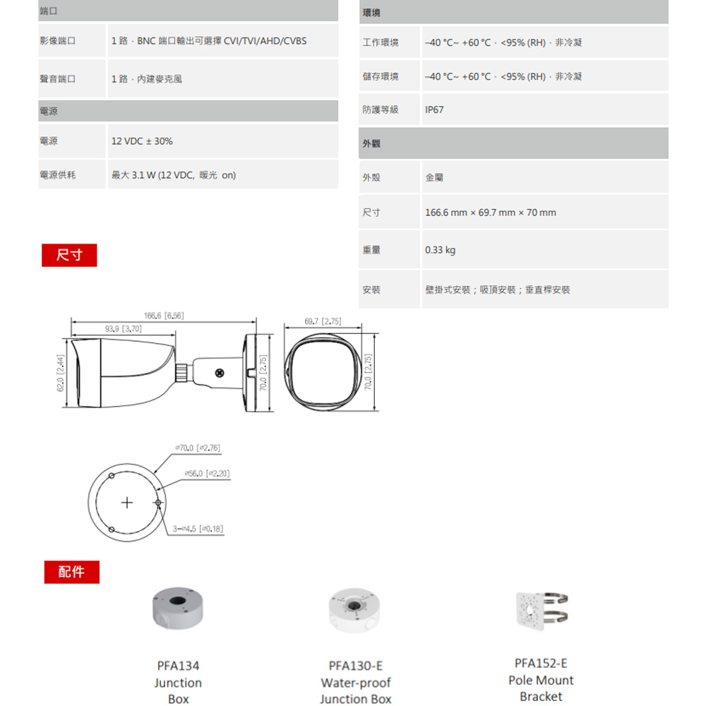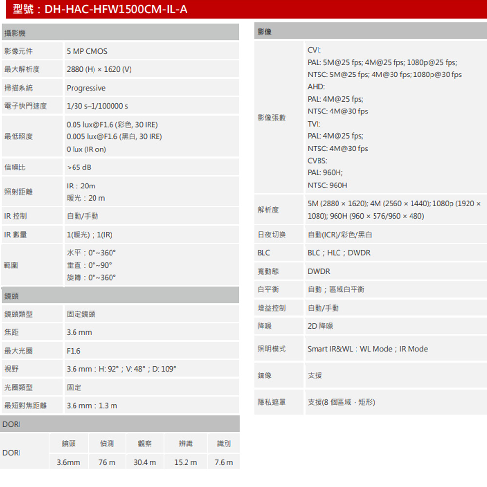 最大25fps@5MP(16:9影像輸出) 智慧雙光技術 20m照射距離 Super Adapt 內建麥克風 3.6mm固定鏡頭 CVI/CVBS/AHD/TVI 可切換。 防護等級IP67,12 VDC