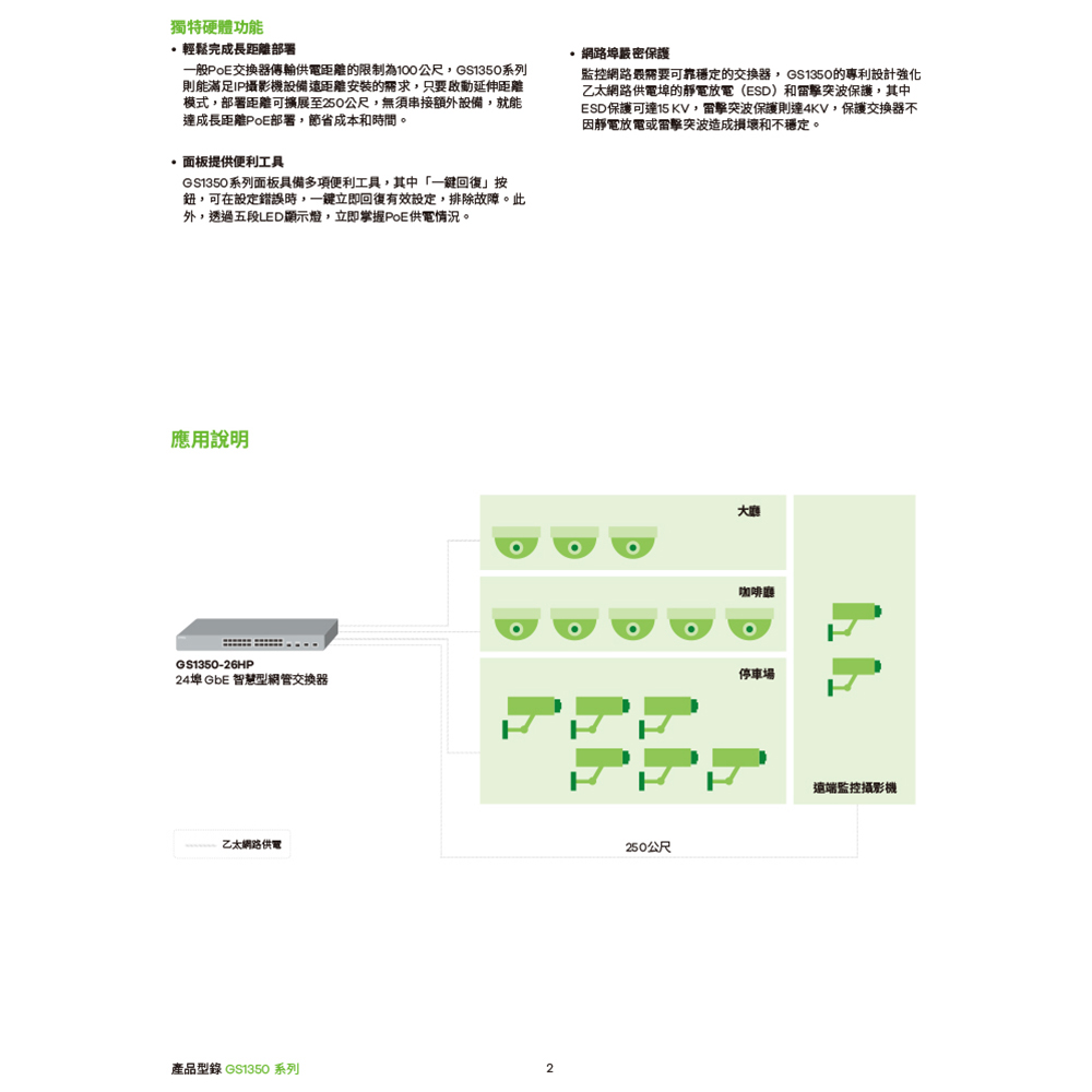 -監控專用進階乙太網路供電管理 Zyxel GS1350系列提供多種監控專用的進階供電管理功能,管理員利用直覺的管理網頁,可以輕鬆管理、監控和維護監控設備。 -攝影機自動救援功能 IP攝影機等受電裝置有時會因為軟體缺陷或惡意侵擾而故障,GS1350系列提供客製化檢測與重啟參數,能自動檢測、恢復中斷的IP攝影機和受電裝置,適用於各種設備和應用情境,大幅減少管理員的修復工作。 -不中斷乙太網路供電 維持設備運作是監控系統最大的挑戰,GS1350系列支援不中斷乙太網路供電功能,當交換器升級韌體或更動設定重新啟動時,仍能正常供應IP攝影機和監控設備所需電力,大幅縮短攝影機重新開機等待時間,讓監控不中斷。 -輕鬆完成長距離部署 一般PoE交換器傳輸供電距離的限制為100公尺,GS1350系列則能滿足IP攝影機設備遠距離安裝的需求,只要啟動延伸距離模式,部署距離可擴展至250公尺,無須串接額外設備,就能達成長距離PoE部署,節省成本和時間。 -面板提供便利工具 GS1350系列面板具備多項便利工具,其中「一鍵回復」按鈕,可在設定錯誤時,一鍵立即回復有效設定,排除故障。此外,透過五段LED顯示燈,立即掌握PoE供電情況。 -網路埠嚴密保護 監控網路最需要可靠穩定的交換器, GS1350的專利設計強化乙太網路供電埠的靜電放電(ESD)和雷擊突波保護,其中ESD保護可達15 KV,雷擊突波保護則達4KV,保護交換器不因靜電放電或雷擊突波造成損壞和不穩定。