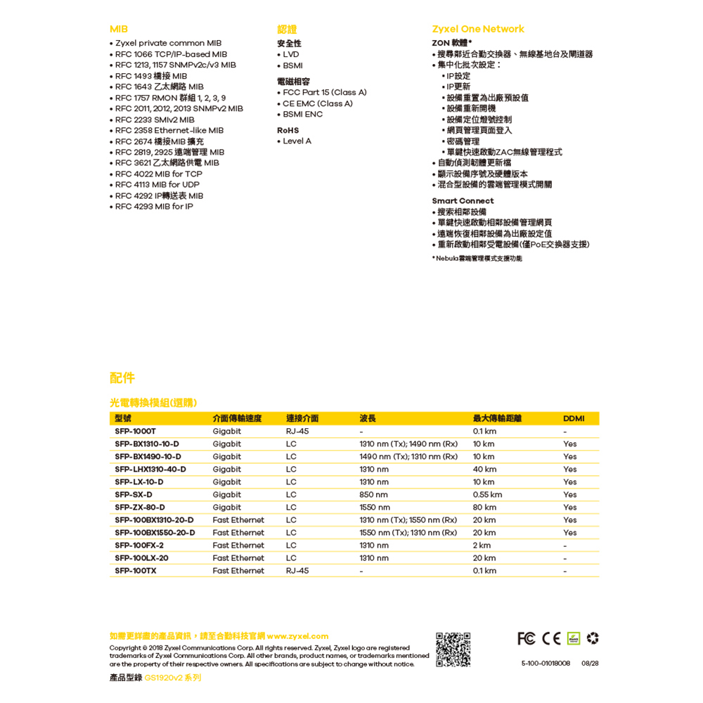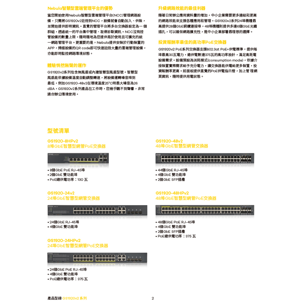 -靜音運轉無風扇設計的GS1920-8HPv2/24v2,以及配有智慧風扇的GS1920-24HPv2/48v2/48HPv2,超靜音模式讓你對運轉聲音無感。-便捷的LED指示燈從面板上的燈號就可以掌握即時的PoE電量使用狀態;如果你使用雲網路模式,還可以看到交換器目前是否有成功連上雲端。-輕鬆接上更多用電設備(PoE機種)每埠供電30W,總供電瓦數達130W或375W兩種選擇。非常適合有高密度PoE供電設備安裝需求的環境。智慧供電模式可自動檢測每台電力設備的用電量狀態,並提供恰好足瓦的電力。-合勤自動感知能力網路可下載的 ZON Utility 只要一個點擊就可以立刻查找與設定網路裡面的交換器、無線網路基地台及資安防火牆。