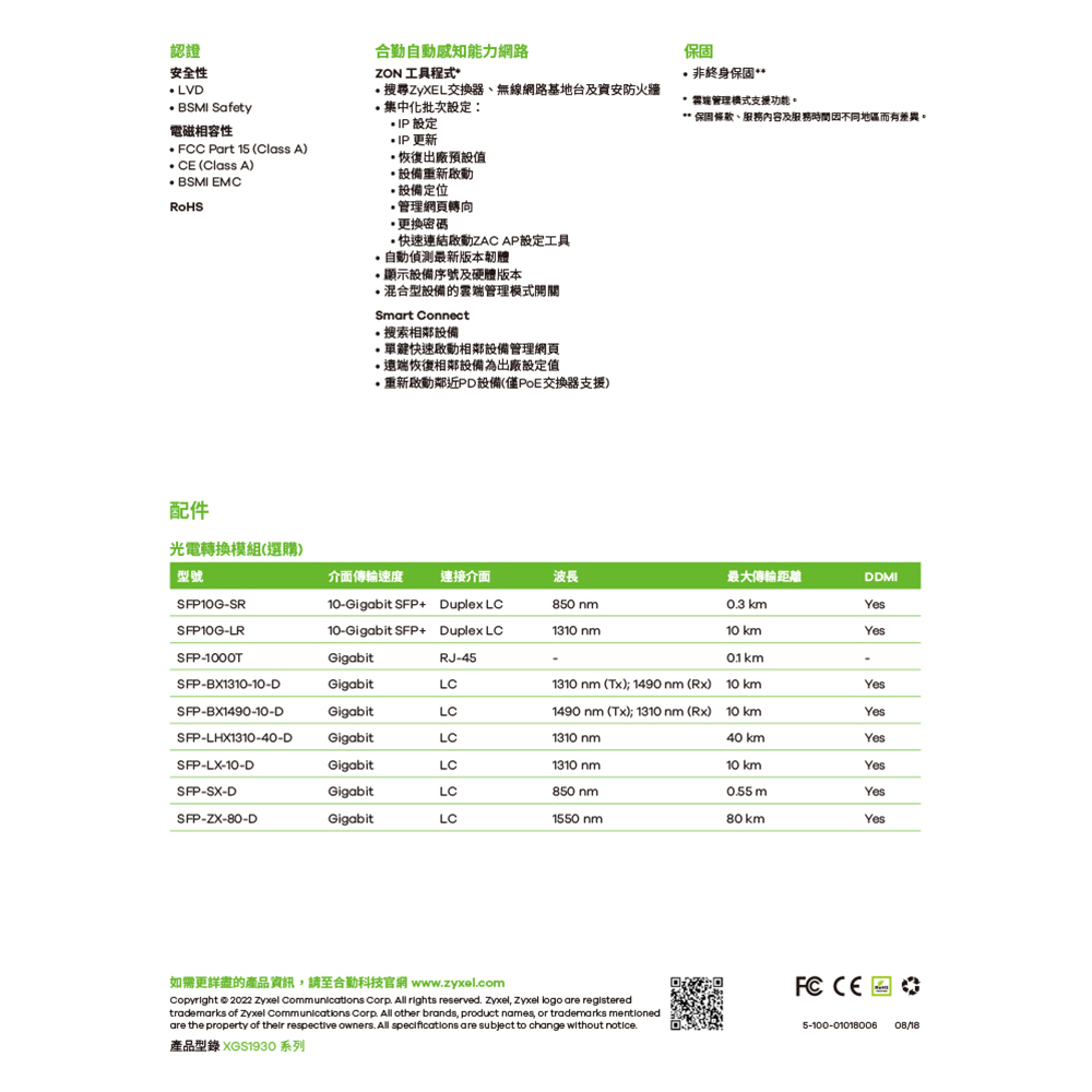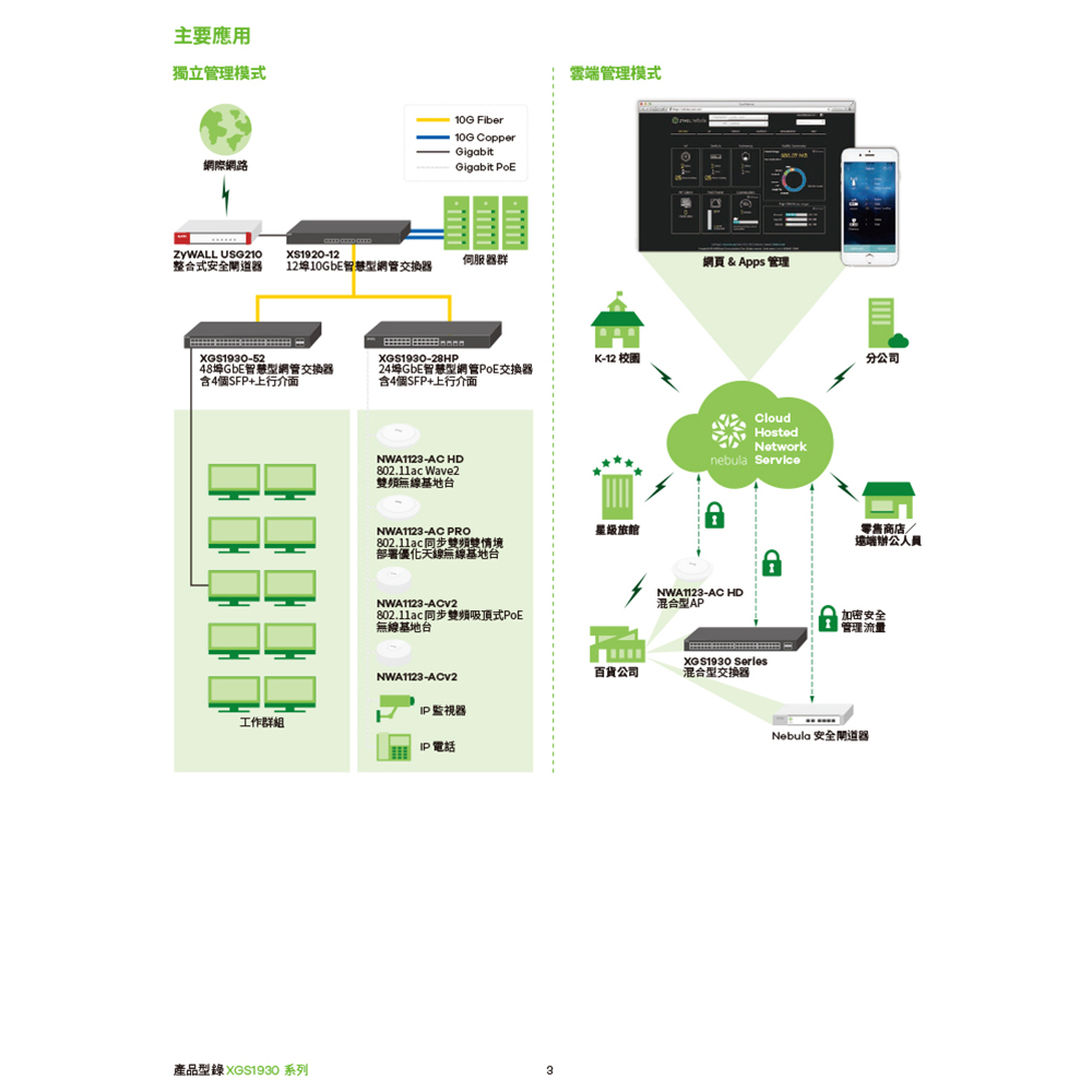 -10G網路方案最經濟實惠的選擇 全新的XGS1930系列是帶有10G SFP+埠的智慧型網管交換器,俱備了時尚外觀,還可透過內建NebulaFlexTM技術做雲端管理。 -升級網路≠花大錢 想要升級網路,同時也需要容易管理,還在你可以負擔的價格裡嗎?帶有24/48個Gigabit埠加上4個10G SFP+的連接埠組合的智慧網管型交換器XGS1930系列絕對是最佳選擇! -靜音運轉 無風扇設計的XGS1930-28,以及配有智慧風扇的XGS1930-28HP/52/52HP,超靜音模式讓你對運轉聲音無感。 -便捷的LED指示燈 從面板上的燈號就可以掌握即時的PoE電量使用狀態;如果你使用雲網路模式,還可以看到交換器目前是否有成功連上雲端。 -合勤自動感知能力網路 可下載的 ZON Utility 軟體只要一個點擊就可以立刻查找與設定網路裡面的交換器、無線網路基地台及資安防火牆。 -品質好,超耐用 合勤堅持使用高品質用料,在智慧網管型交換器上不計成本配備了企業等級的硬體設計與最先進的硬體技術,提供中小企業穩健的網路環境!