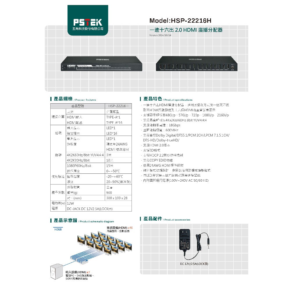 昌運監視器 HSP-22216H 一進十六出 2.0 HDMI 廣播分配器 支援HDMI 2.0版本 支援3D格式