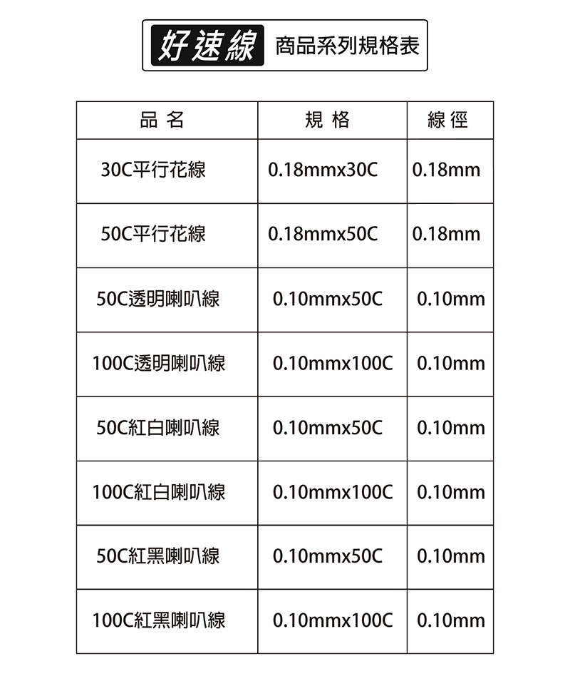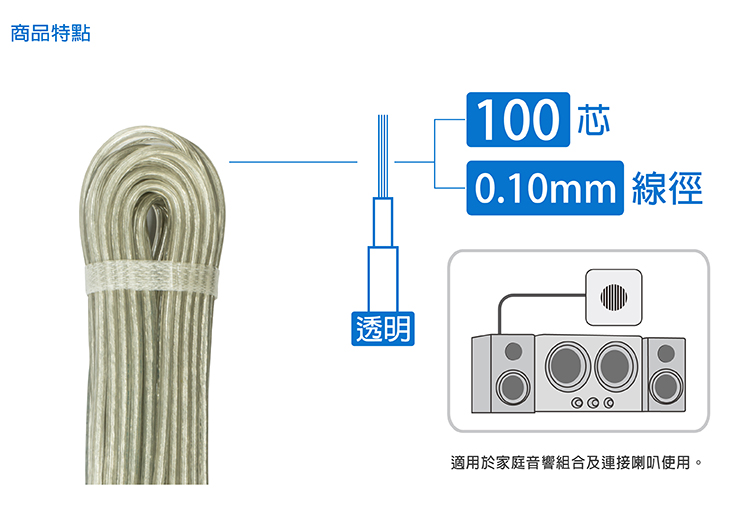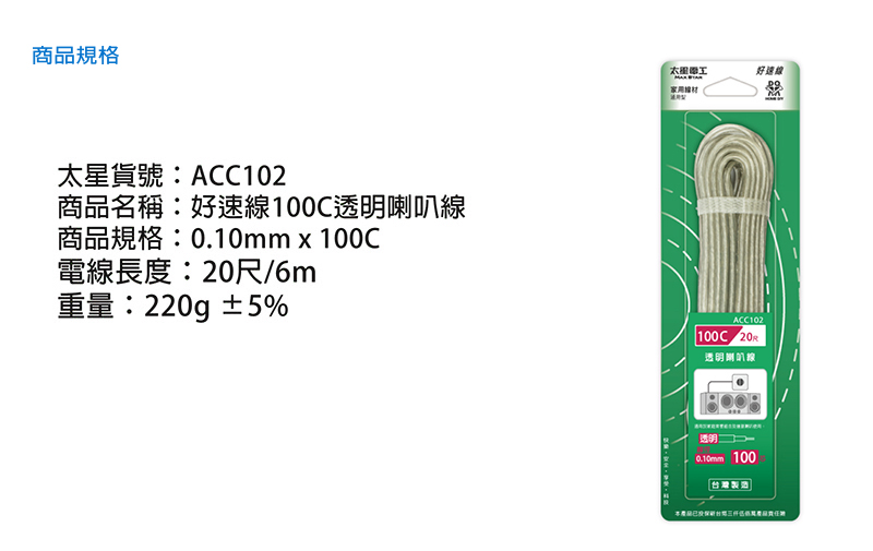 ◆商品特色1、適用於家庭音響組合及連接喇叭使用。2、台灣製造 品質有保障。3、DIY動手做,輕鬆便利。4、耐拉扯、耐磨損、不易斷。5、本產品已投保新台幣三仟伍佰萬產品責任險。相關線材功能音響喇叭線:適用於家庭音響組合及連接喇叭使用。平行花線:適用於臨時電源連接或延長線使用。電視電纜線:適用於電視機使用。電話電纜線:適用於室內電話機及牽引室內分機使用。◆商品規格與尺寸商品尺寸:(高)20.0x(寬)4.5x(深)2.0 /公分包裝尺寸:(高)25.2x(寬)7.7x(深)3.6 /公分商品重量:0.22kg ±5%包裝重量:0.27kg ±5%電線規格:0.10mm X 100C電線長度:6M/20尺商品原產地:中華民國 台灣◆注意事項1.避免使用固定夾固定電線,於電線固定加力時避免傷及電線。2.電線摺彎處,脆弱易受傷害,應視察注意其安全性。◆警告1.電線勿打結或固定使用,應全部伸展使用。2.本商品係音響、喇叭連接專用,不適用於一般電力連接。