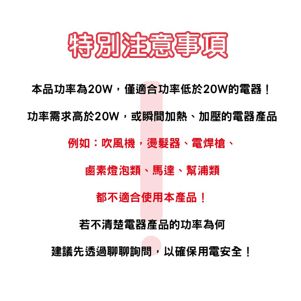功率需求高於20W,或瞬間加熱、加壓的電器產品(例如:吹風機,燙髮器、電焊槍、鹵素燈泡類、馬達、幫浦類)都不適合使用本產品,若不清楚電器產品的功率為何,建議先透過聊聊詢問,以確保用電安全!