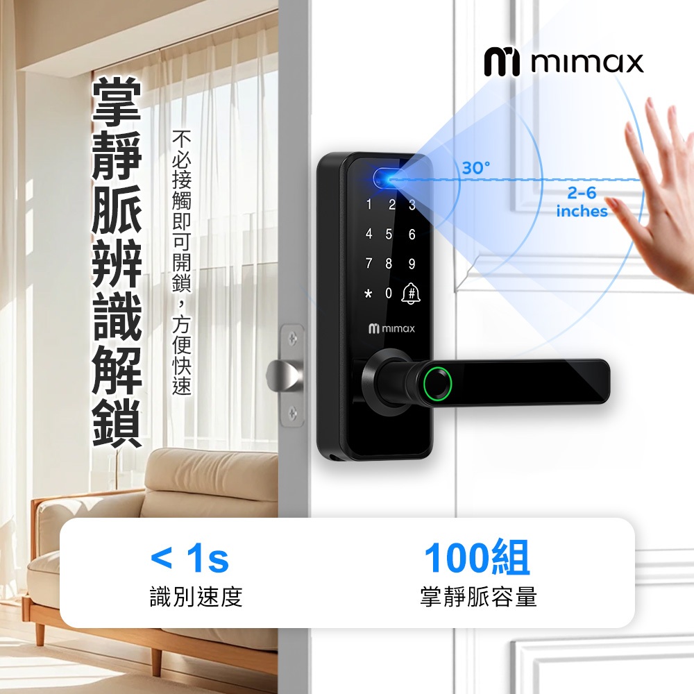 mimax Facial & Palm Vein Recognition Smart Door Lock – Room Use, No-Drill Installation