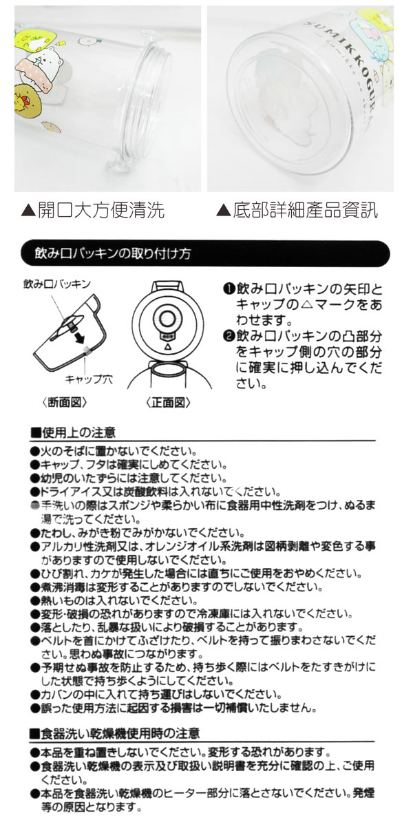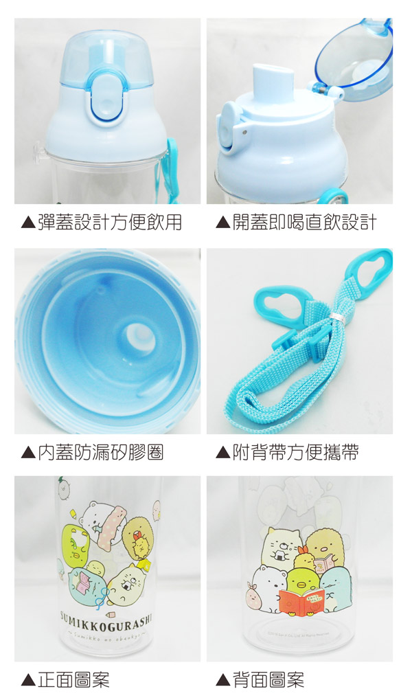 日本製造品質安心,可愛角落小夥伴卡通圖案,大容量方便飲用,不用一直裝水,EASY一指彈開,可立式可橫躺,自由自在置放方便,方便攜帶,緊閉不漏水,堅固耐用容易清洗。